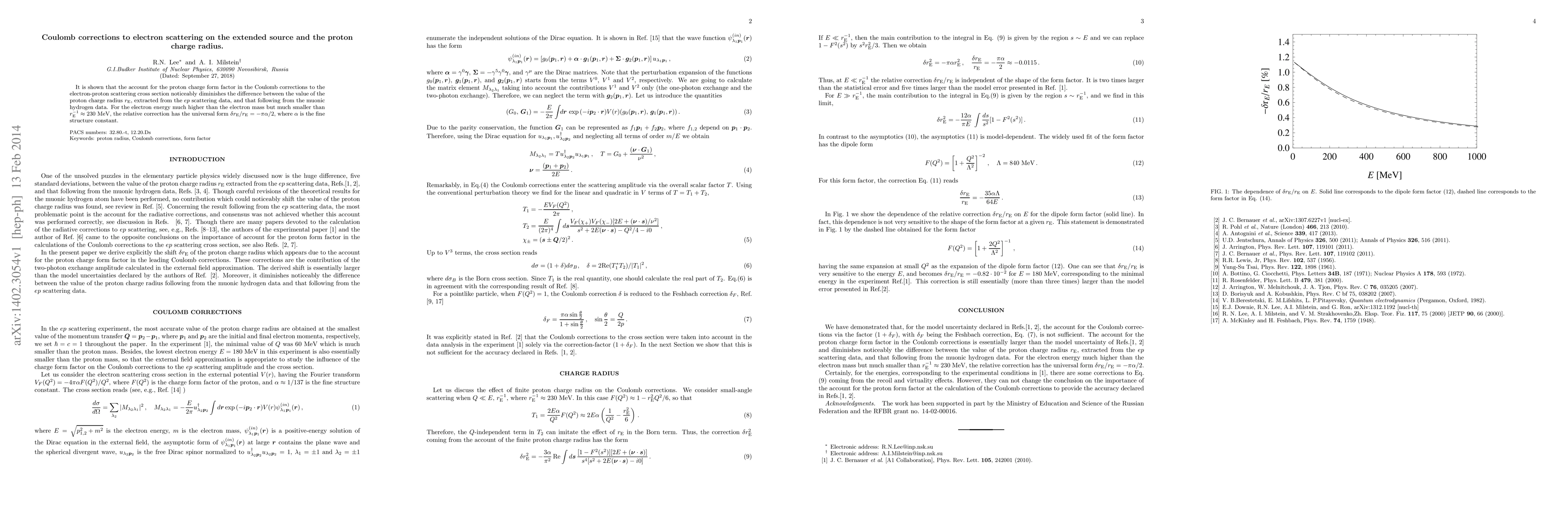 It is shown that the account for the proton charge form factor in the Coulomb corrections to the electron-proton scattering cross section noticeably diminishes the difference between the value of the proton charge radius $r_{\mathrm{E}}$, extracted from the $ep$ scattering data, and that following from the muonic hydrogen data. For the electron energy much higher than the electron mass but much smaller than $r_{\mathrm{E}}^{-1}\approx 230$~MeV, the relative correction has the universal form $\delta r_{\mathrm{E}}/r_{\mathrm{E}}=-\pi\alpha/2$, where $\alpha$ is the fine structure constant.