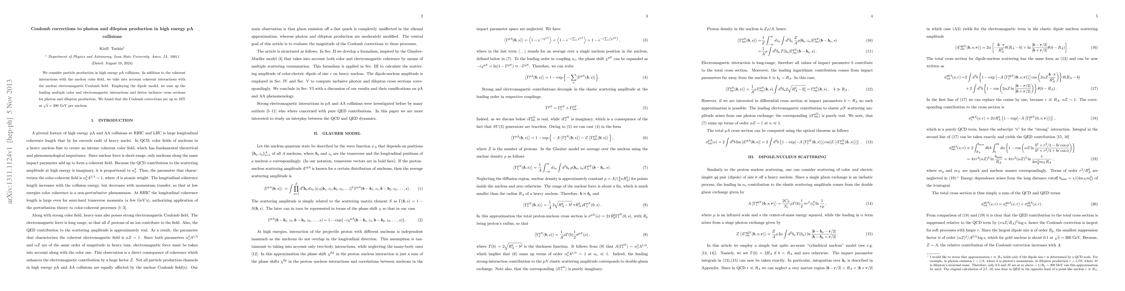 We consider particle production in high energy pA collisions. In addition to the coherent interactions with the nuclear color field, we take into account coherent interactions with the nuclear electromagnetic Coulomb field. Employing the dipole model, we sum up the leading multiple color and electromagnetic interactions and derive inclusive cross sections for photon and dilepton production. We found that the Coulomb corrections are up to $10\%$ at $\sqrt{s}=200$~GeV per nucleon.