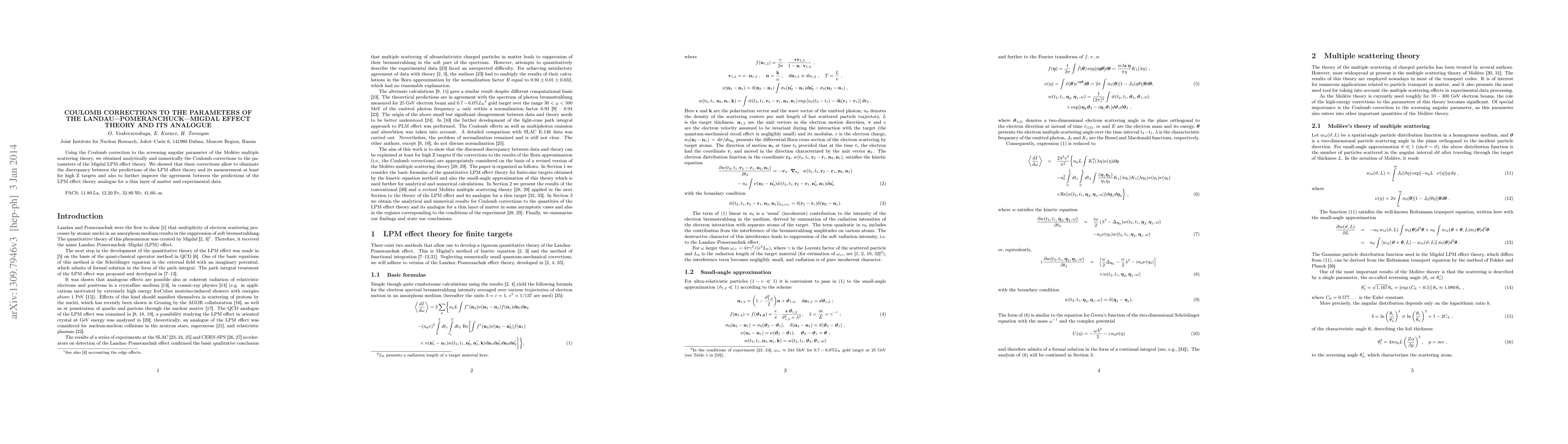 Using the Coulomb correction to the screening angular parameter of the Moliere multiple scattering theory, we obtained analytically and numerically the Coulomb corrections to the parameters of the Migdal LPM effect theory. We showed that these corrections allow to eliminate the discrepancy between the predictions of the LPM effect theory and its measurement at least for high Z targets and also to further improve the agreement between the predictions of the LPM effect theory analogue for a thin layer of matter and experimental data.