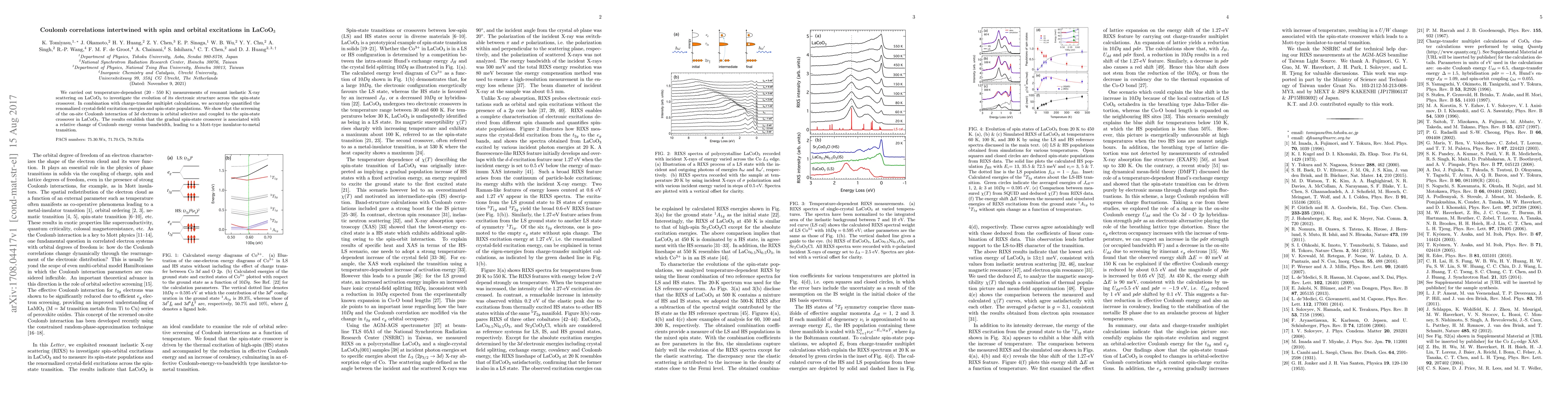 We carried out temperature-dependent (20 - 550 K) measurements of resonant inelastic X-ray scattering on LaCoO$_3$ to investigate the evolution of its electronic structure across the spin-state crossover. In combination with charge-transfer multiplet calculations, we accurately quantized the renormalized crystal-field excitation energies and spin-state populations. We show that the screening of the on-site Coulomb interaction of 3d electrons is orbital selective and coupled to the spin-state crossover in LaCoO$_3$. The results establish that the gradual spin-state crossover is associated with a relative change of Coulomb energy versus bandwidth, leading to a Mott-type insulator-to-metal transition.