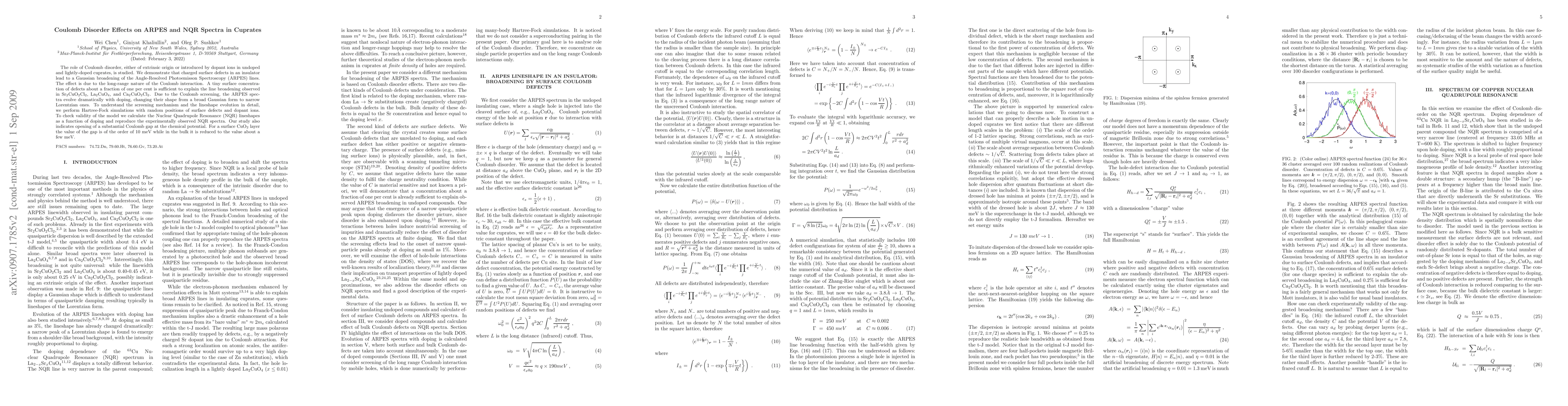The role of Coulomb disorder, either of extrinsic origin or introduced by dopant ions in undoped and lightly-doped cuprates, is studied. We demonstrate that charged surface defects in an insulator lead to a Gaussian broadening of the Angle-Resolved Photoemisson Spectroscopy (ARPES) lines. The effect is due to the long-range nature of the Coulomb interaction. A tiny surface concentration of defects about a fraction of one per cent is sufficient to explain the line broadening observed in Sr$_2$CuO$_2$Cl$_2$, La$_2$CuO$_{4}$, and Ca$_{2}$CuO$_{2}$Cl$_{2}$. Due to the Coulomb screening, the ARPES spectra evolve dramatically with doping, changing their shape from a broad Gaussian form to narrow Lorentzian ones. To understand the screening mechanism and the lineshape evolution in detail, we perform Hartree-Fock simulations with random positions of surface defects and dopant ions. To check validity of the model we calculate the Nuclear Quadrupole Resonance (NQR) lineshapes as a function of doping and reproduce the experimentally observed NQR spectra. Our study also indicates opening of a substantial Coulomb gap at the chemical potential. For a surface CuO$_2$ layer the value of the gap is of the order of 10 meV while in the bulk it is reduced to the value about a few meV.