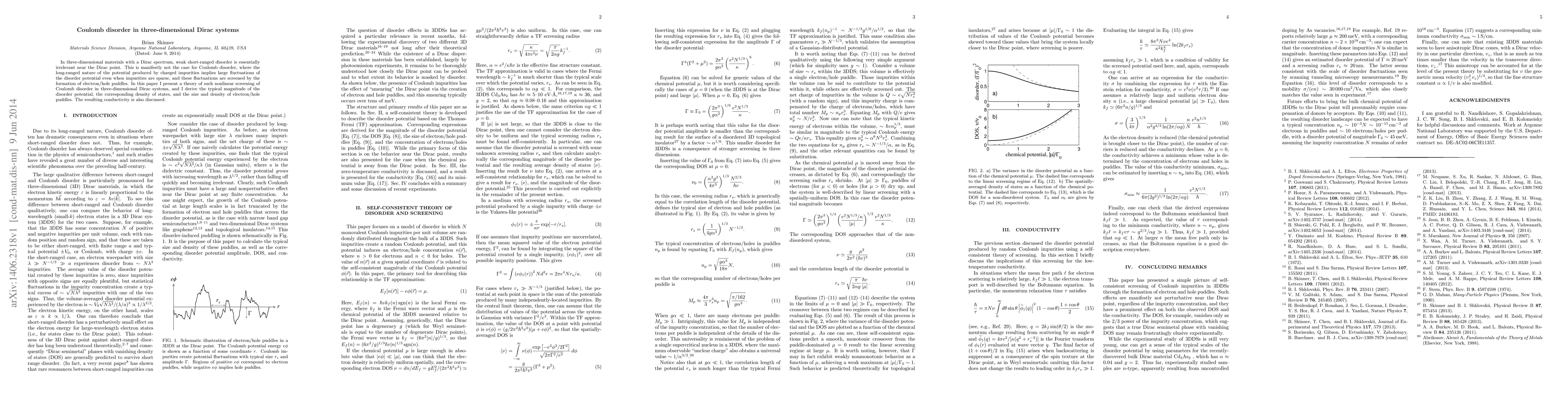 This paper develops a theoretical framework for understanding Coulomb disorder in three-dimensional Dirac systems, showing that long-ranged Coulomb potentials from charged impurities lead to significant disorder fluctuations and nonlinear screening, affecting the density of states, puddle formation, and conductivity.