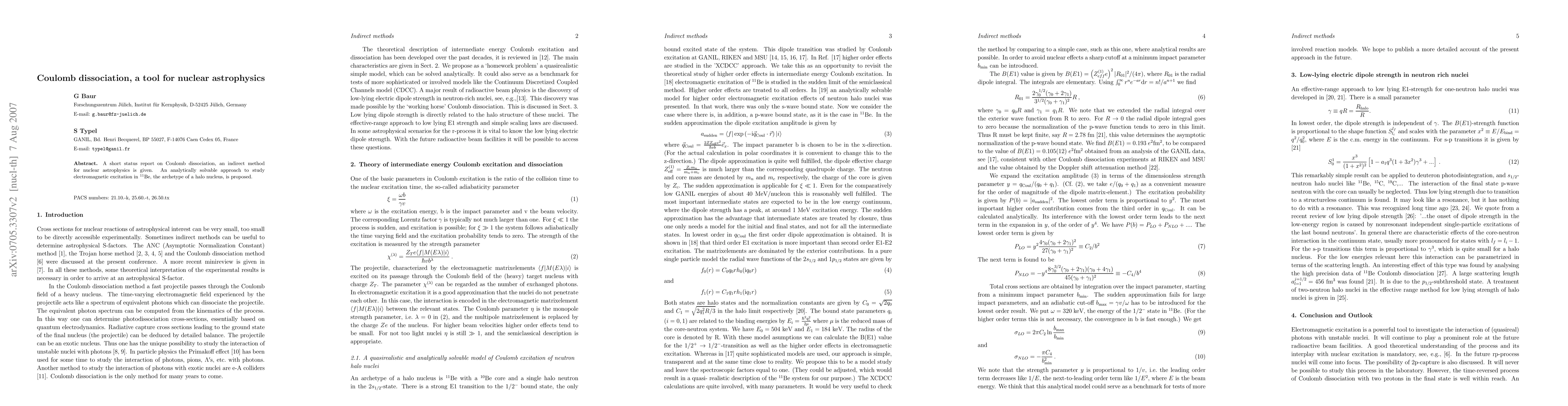 A short status report on Coulomb dissociation, an indirect method for nuclear astrophysics is given. An analytically solvable approach to study electromagnetic excitation in ^{11}Be, the archetype of a halo nucleus, is proposed.