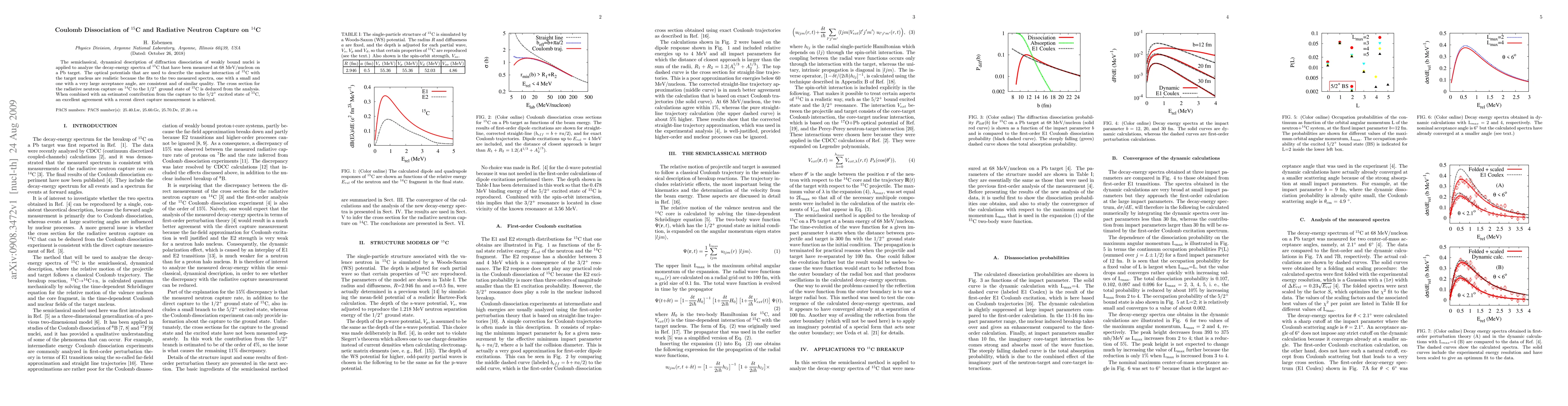 Researchers analyzed the decay-energy spectra of $^{15}$C nuclei using a semiclassical model, deducing the cross section for radiative neutron capture on $^{14}$C and achieving excellent agreement with a recent direct measurement.