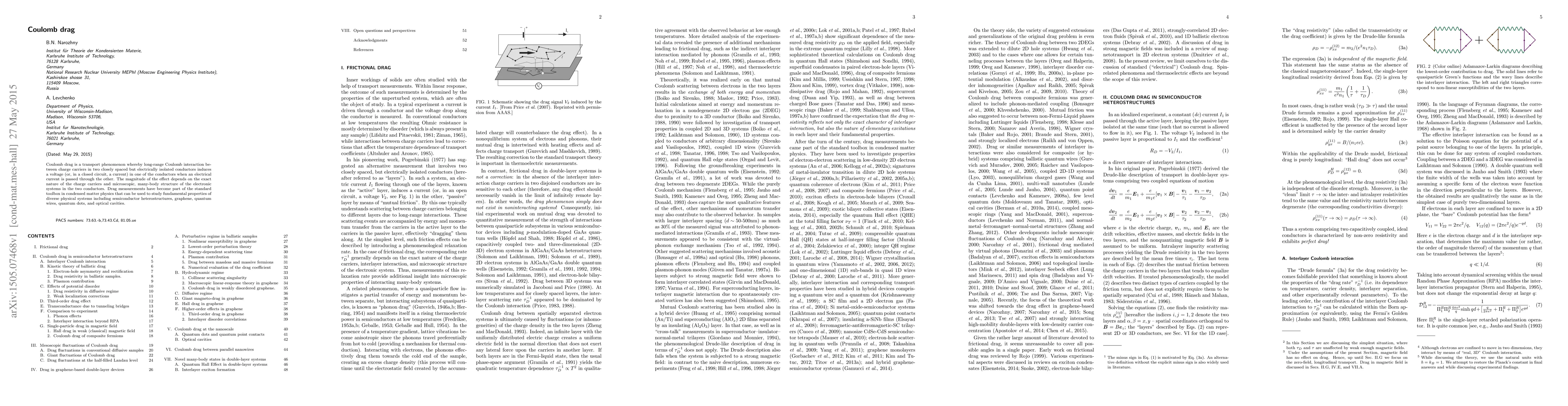 Coulomb drag is a transport phenomenon whereby long-range Coulomb interaction between charge carriers in two closely spaced but electrically isolated conductors induces a voltage (or, in a closed circuit, a current) in one of the conductors when an electrical current is passed through the other. The magnitude of the effect depends on the exact nature of the charge carriers and microscopic, many-body structure of the electronic systems in the two conductors. Drag measurements have become part of the standard toolbox in condensed matter physics that can be used to study fundamental properties of diverse physical systems including semiconductor heterostructures, graphene, quantum wires, quantum dots, and optical cavities.