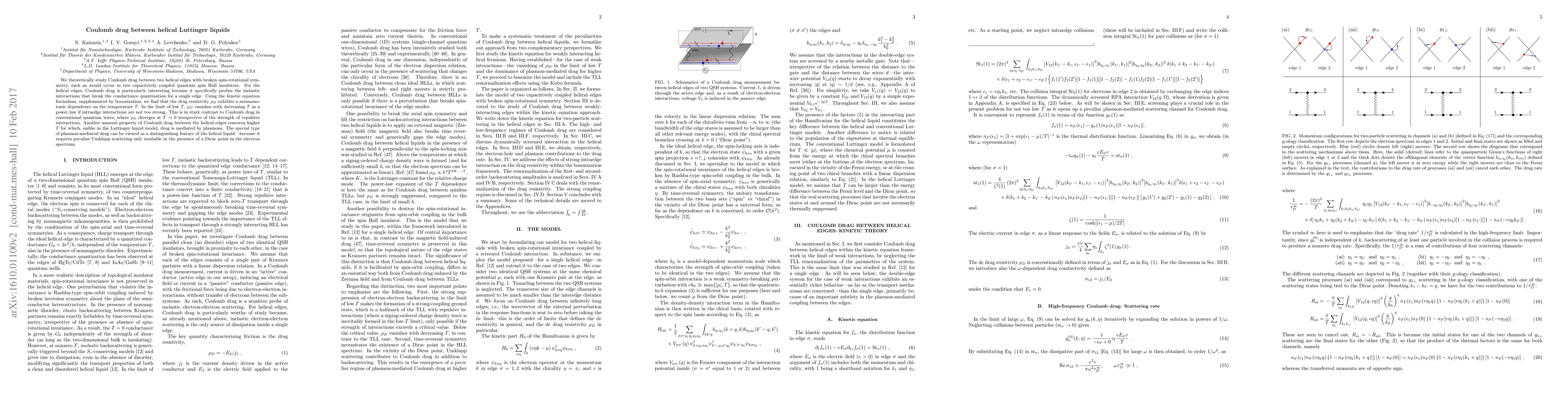 We theoretically study Coulomb drag between two helical edges with broken spin-rotational symmetry, such as would occur in two capacitively coupled quantum spin Hall insulators. For the helical edges, Coulomb drag is particularly interesting because it specifically probes the inelastic interactions that break the conductance quantization for a single edge. Using the kinetic equation formalism, supplemented by bosonization, we find that the drag resistivity $\rho_D$ exhibits a nonmonotonic dependence on the temperature $T$. In the limit of low $T$, $\rho_D$ vanishes with decreasing $T$ as a power law if intraedge interactions are not too strong. This is in stark contrast to Coulomb drag in conventional quantum wires, where $\rho_D$ diverges at $T\to 0$ irrespective of the strength of repulsive interactions. Another unusual property of Coulomb drag between the helical edges concerns higher $T$ for which, unlike in the Luttinger liquid model, drag is mediated by plasmons. The special type of plasmon-mediated drag can be viewed as a distinguishing feature of the helical liquid---because it requires peculiar Umklapp scattering only available in the presence of a Dirac point in the electron spectrum.