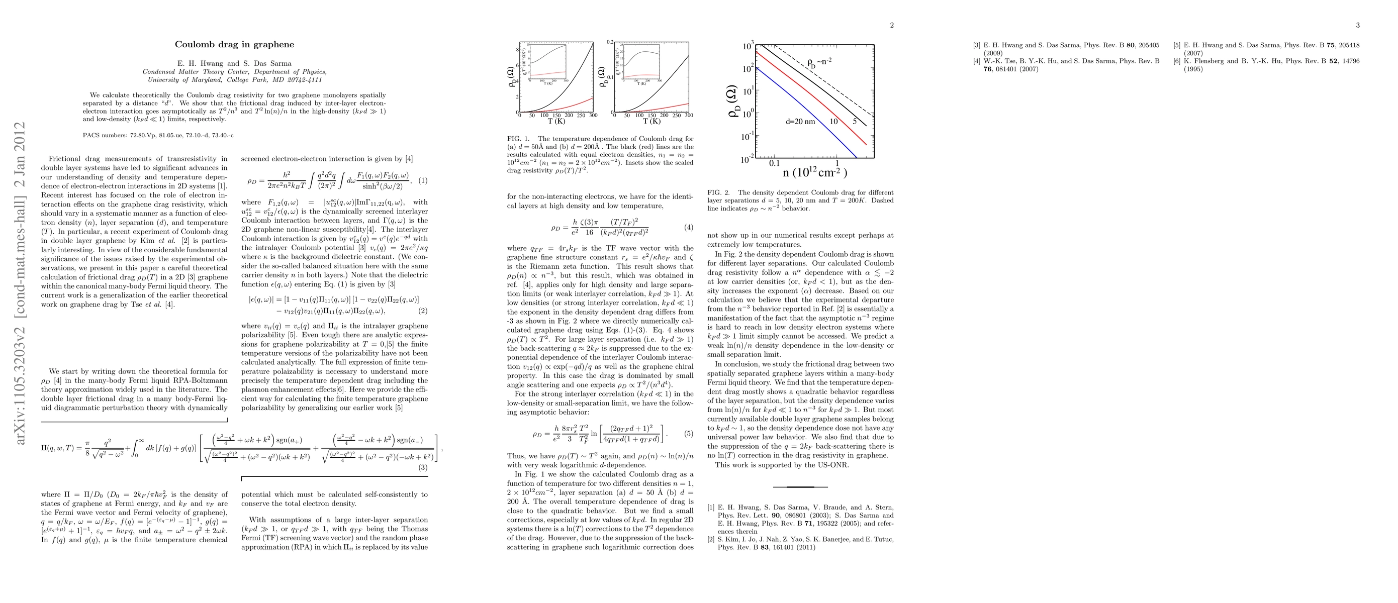 The paper theoretically investigates Coulomb drag resistivity in two spatially separated graphene monolayers, revealing that the drag follows $T^2/n^3$ in high-density and $T^2 \ln(n)/n$ in low-density regimes.