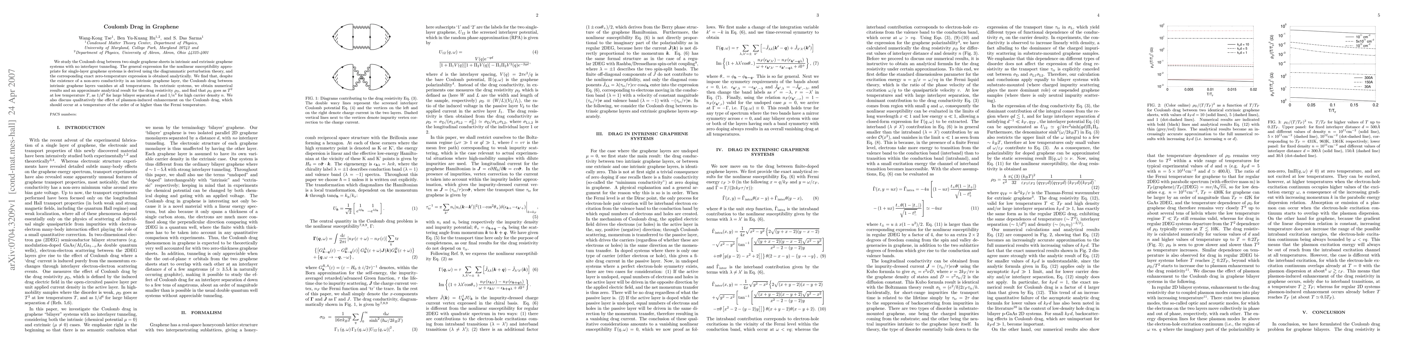 This paper derives expressions for Coulomb drag between two graphene sheets using diagrammatic perturbation theory, revealing that intrinsic graphene layers exhibit no drag at any temperature. For extrinsic systems, it finds that drag resistivity depends on temperature, separation distance, and carrier density, and discusses plasmon-induced enhancement effects.