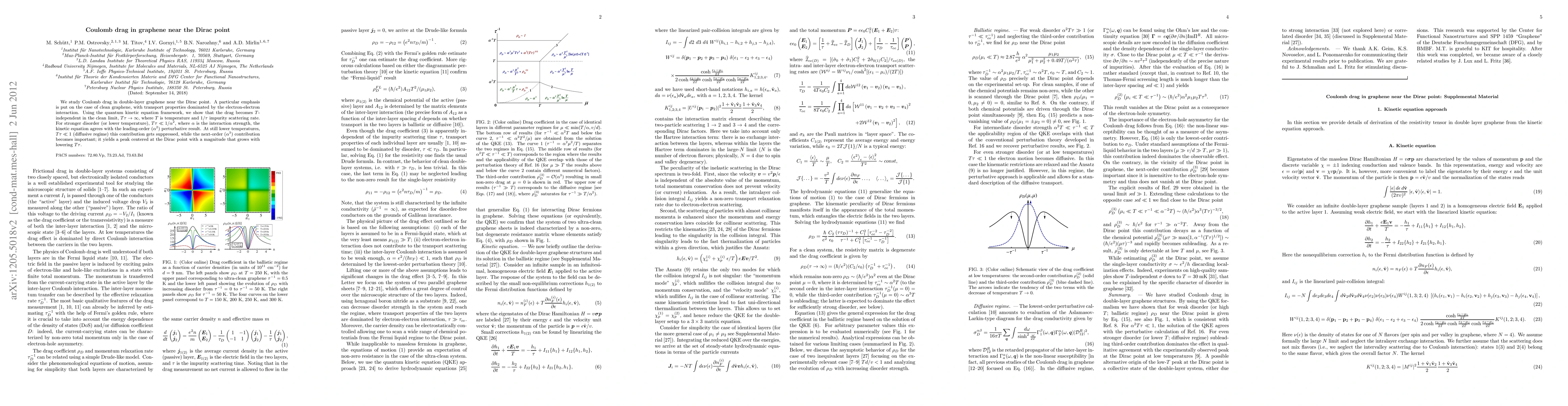 This paper investigates Coulomb drag in clean double-layer graphene near the Dirac point, revealing $T$-independent drag in the clean limit. It further identifies a peak in the drag contribution at the Dirac point in the diffusive regime, with its magnitude increasing as temperature decreases.