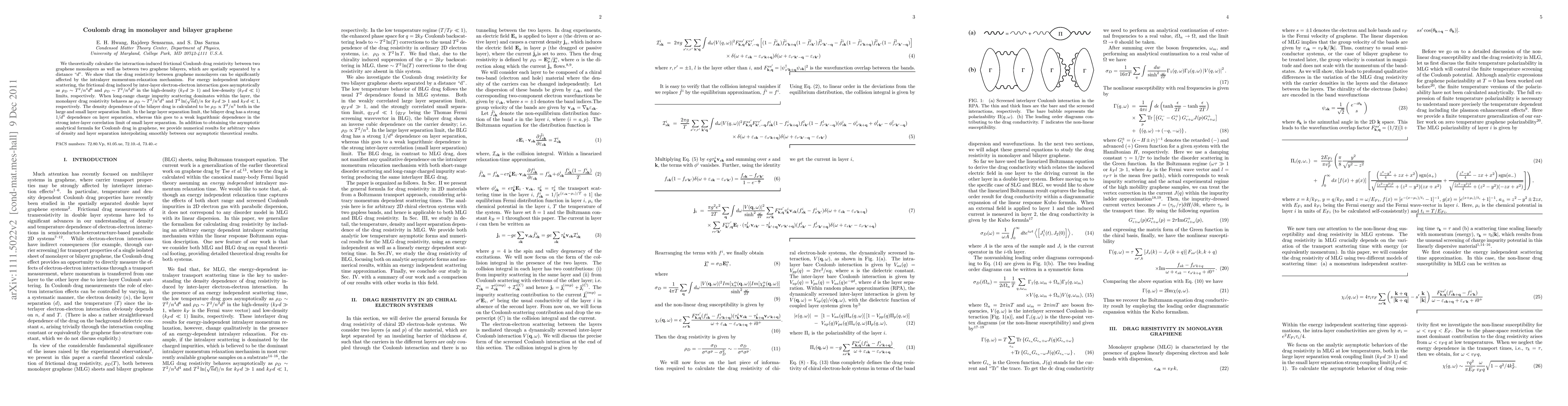 We theoretically calculate the interaction-induced frictional Coulomb drag resistivity between two graphene monolayers as well as between two graphene bilayers, which are spatially separated by a distance "$d$". We show that the drag resistivity between graphene monolayers can be significantly affected by the intralayer momentum-relaxation mechanism. For energy independent intralayer scattering, the frictional drag induced by inter-layer electron-electron interaction goes asymptotically as $\rho_D \sim T^2/n^4d^6$ and $\rho_D \sim T^2/n^2d^2$ in the high-density ($k_F d \gg 1$) and low-density ($k_F d \ll 1$) limits, respectively. When long-range charge impurity scattering dominates within the layer, the monolayer drag resistivity behaves as $\rho_D \sim T^2/n^3d^4$ and $T^2 \ln (\sqrt{n} d) /n$ for $k_F d \gg 1$ and $k_F d \ll 1$, respectively. The density dependence of the bilayer drag is calculated to be $\rho_D \propto T^2/n^{3}$ both in the large and small layer separation limit. In the large layer separation limit, the bilayer drag has a strong $1/d^4$ dependence on layer separation, whereas this goes to a weak logarithmic dependence in the strong inter-layer correlation limit of small layer separation. In addition to obtaining the asymptotic analytical formula for Coulomb drag in graphene, we provide numerical results for arbitrary values of density and layer separation interpolating smoothly between our asymptotic theoretical results.