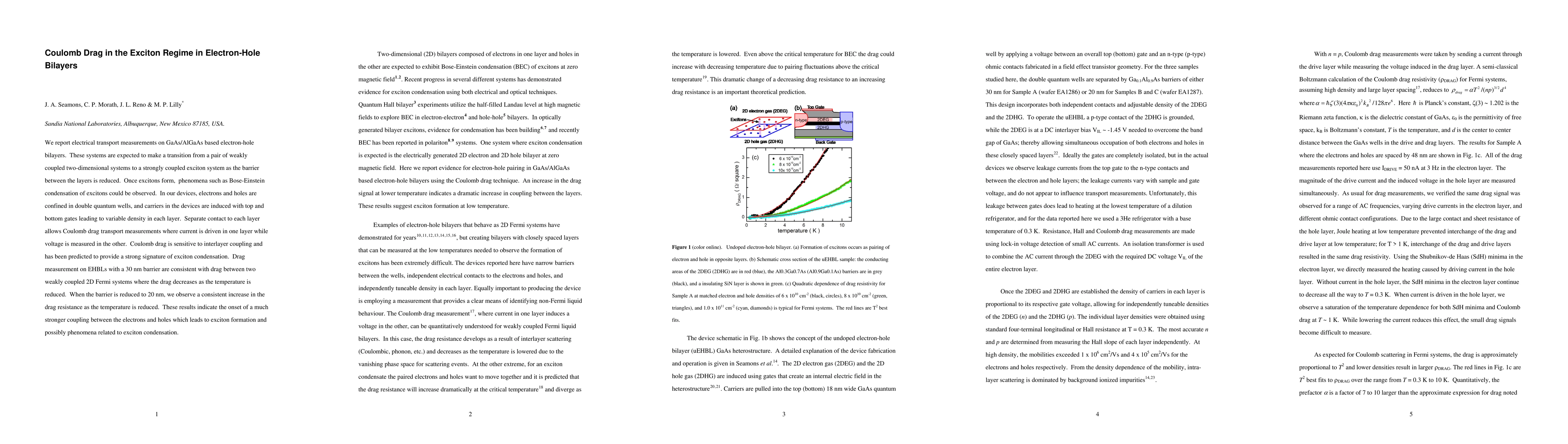 The paper reports on Coulomb drag measurements in GaAs/AlGaAs electron-hole bilayers, showing a transition from weakly coupled 2D systems to exciton formation as the barrier is reduced, indicated by increased drag resistance at lower temperatures when the barrier is thinner.