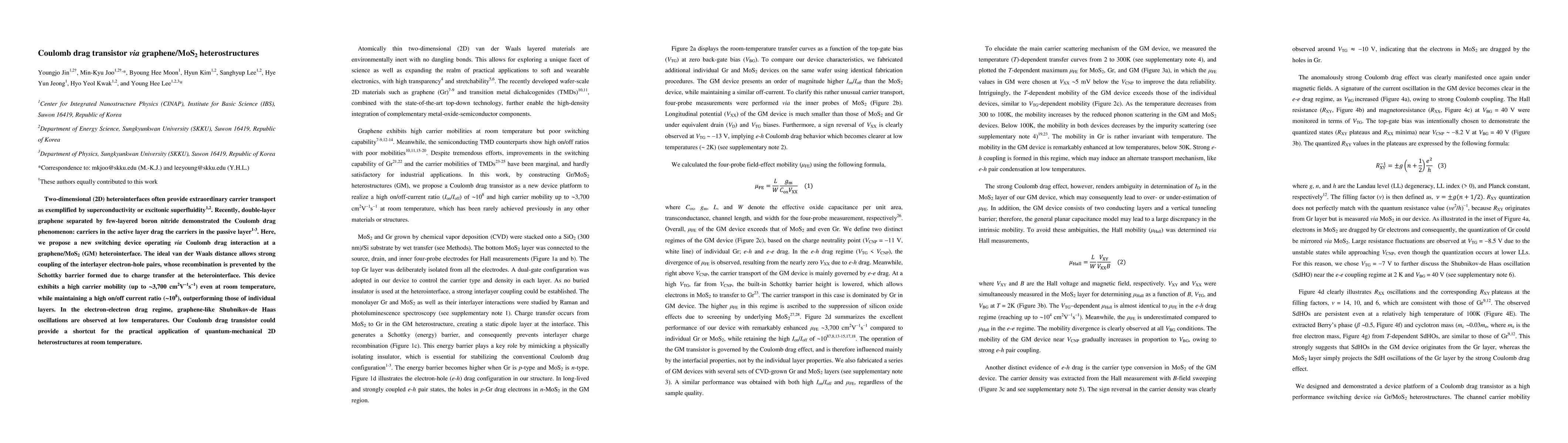 This research proposes a novel switching device utilizing Coulomb drag interaction in a graphene/MoS2 heterointerface, demonstrating high carrier mobility and an impressive on/off current ratio. The device operates effectively at room temperature, offering potential for practical applications of quantum-mechanical 2D heterostructures.