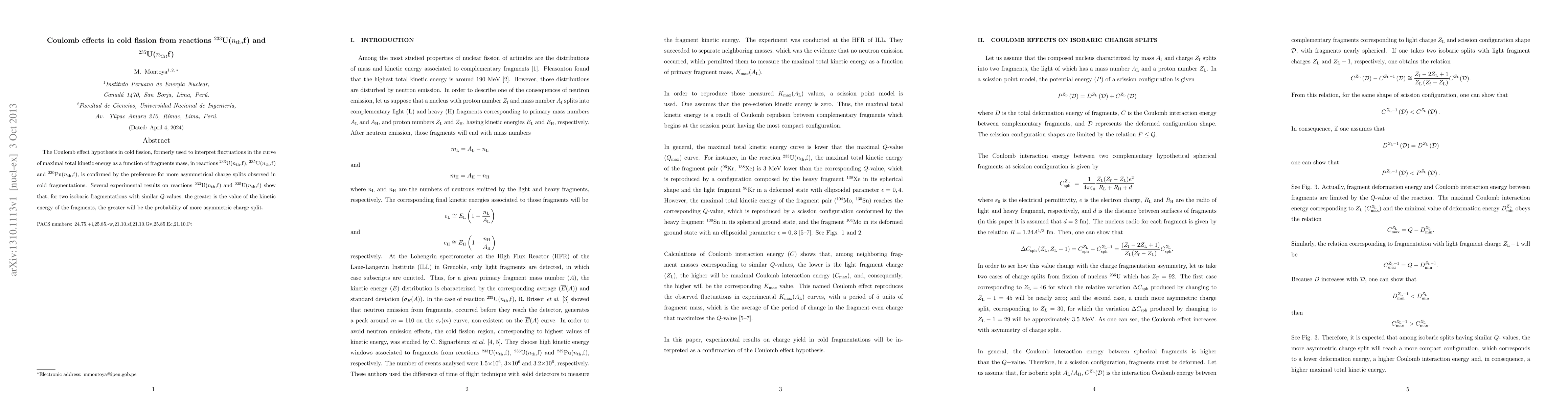 The paper confirms the Coulomb effect hypothesis in cold fission through experimental observations of more asymmetrical charge splits in reactions 233U(nth,f) and 235U(nth,f), showing a higher probability of asymmetric charge division with greater fragment kinetic energy. This supports the interpretation of kinetic energy fluctuations in fission as indicative of Coulomb effects.