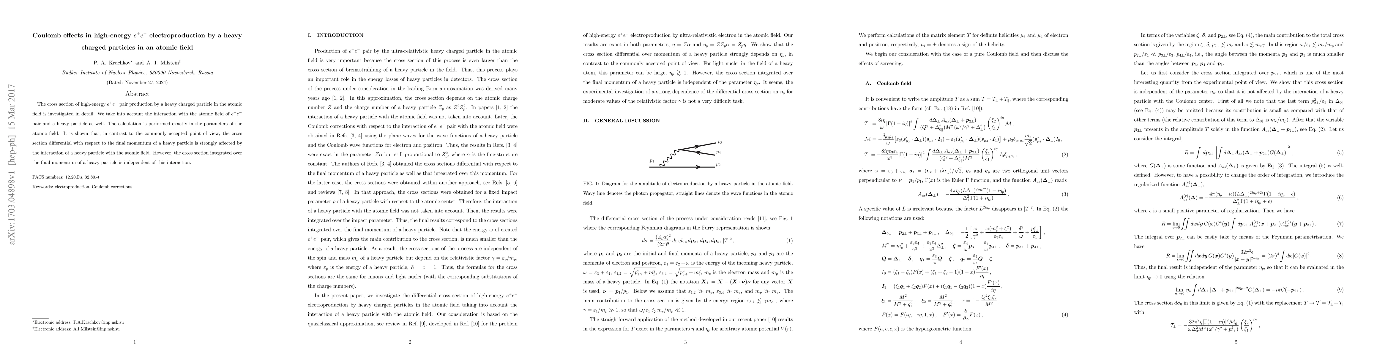This paper investigates high-energy $e^+e^-$ pair production by a heavy charged particle in an atomic field, revealing that the differential cross section is significantly influenced by the interaction with the atomic field, while the integrated cross section remains unaffected. The calculations are performed precisely within the parameters of the atomic field.