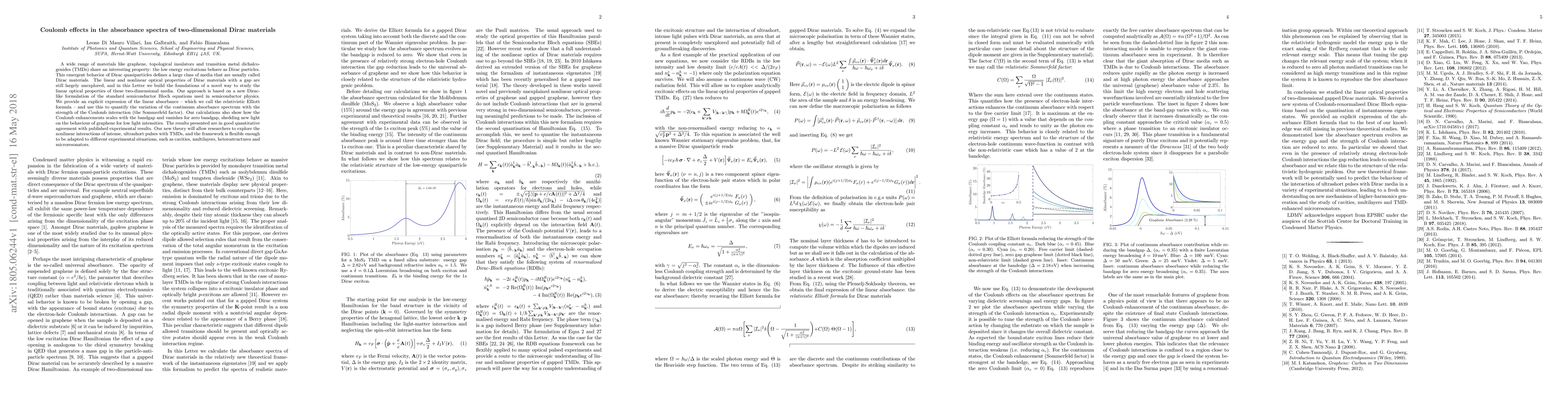 A wide range of materials like graphene, topological insulators and transition metal dichalcogenides (TMDs) share an interesting property: the low energy excitations behave as Dirac particles. This emergent behavior of Dirac quasiparticles defines a large class of media that are usually called Dirac materials. The linear and nonlinear optical properties of Dirac materials with a gap are still largely unexplored, and in this Letter we build the foundations of a novel way to study the linear optical properties of these two-dimensional media. Our approach is based on a new Dirac-like formulation of the standard semiconductor Bloch equations used in semiconductor physics. We provide an explicit expression of the linear absorbance -- which we call the relativistic Elliott formula -- and use this to quantify the variation of the continuum absorbance spectrum with the strength of the Coulomb interaction (the Sommerfeld factor). Our calculations also show how the Coulomb enhancements scales with the bandgap and vanishes for zero bandgap, shedding new light on the behaviour of graphene for low light intensities. The results presented are in good quantitative agreement with published experimental results. Our new theory will allow researchers to explore the nonlinear interactions of intense, ultrashort pulses with TMDs, and the framework is flexible enough to be adapted to different experimental situations, such as cavities, multilayers, heterostructures and microresonators.