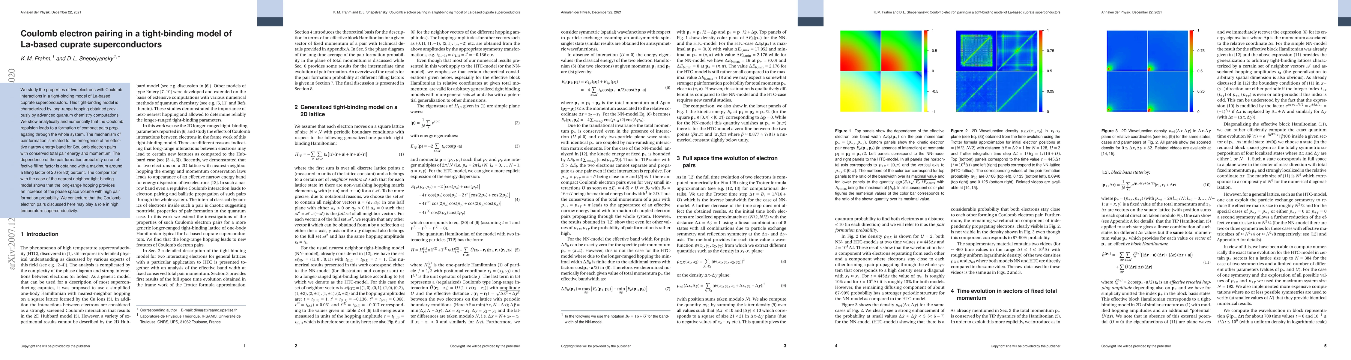 This paper investigates Coulomb electron pairing in a tight-binding model of La-based cuprate superconductors, demonstrating that long-range hopping enhances pair formation due to an effective narrow energy band. The study suggests that these Coulomb electron pairs may contribute to high-temperature superconductivity.