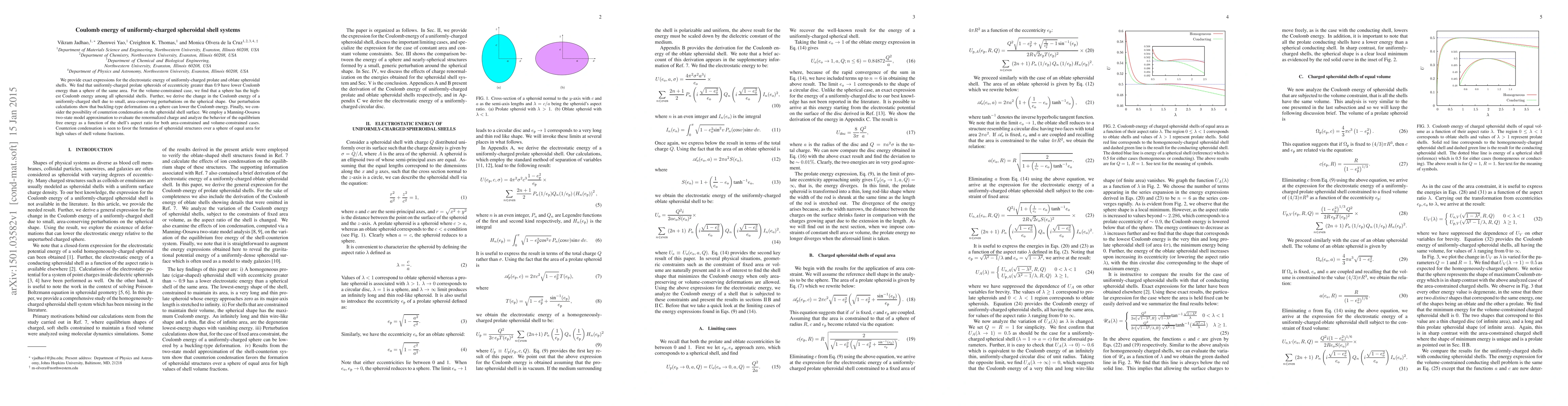 We provide exact expressions for the electrostatic energy of uniformly-charged prolate and oblate spheroidal shells. We find that uniformly-charged prolate spheroids of eccentricity greater than 0.9 have lower Coulomb energy than a sphere of the same area. For the volume-constrained case, we find that a sphere has the highest Coulomb energy among all spheroidal shells. Further, we derive the change in the Coulomb energy of a uniformly-charged shell due to small, area-conserving perturbations on the spherical shape. Our perturbation calculations show that buckling-type deformations on a sphere can lower the Coulomb energy. Finally, we consider the possibility of counterion condensation on the spheroidal shell surface. We employ a Manning-Oosawa two-state model approximation to evaluate the renormalized charge and analyze the behavior of the equilibrium free energy as a function of the shell's aspect ratio for both area-constrained and volume-constrained cases. Counterion condensation is seen to favor the formation of spheroidal structures over a sphere of equal area for high values of shell volume fractions.