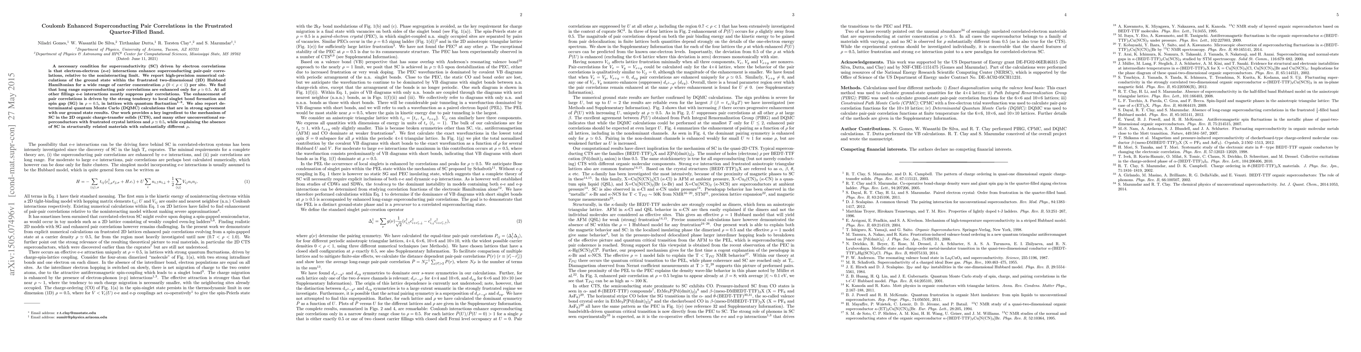 A necessary condition for superconductivity (SC) driven by electron correlations is that electron-electron (e-e) interactions enhance superconducting pair-pair correlations, relative to the noninteracting limit. We report high-precision numerical calculations of the ground state within the frustrated two-dimensional (2D) Hubbard Hamiltonian for a wide range of carrier concentration $\rho$ (0 < $\rho$ <1) per site. We find that long range superconducting pair correlations are enhanced only for $\rho$ $\simeq$ 0.5. At all other fillings e-e interactions mostly suppress pair correlations. The enhancement of pair correlations is driven by the strong tendency to local singlet bond formation and spin gap (SG) in $\rho$ = 0.5, in lattices with quantum fluctuation. We also report determinantal quantum Monte Carlo (DQMC) calculations that are in strong agreement with our ground state results. Our work provides a key ingredient to the mechanism of SC in the 2D organic charge-transfer solids (CTS), and many other unconventional superconductors with frustrated crystal lattices and $\rho$ $\simeq$ 0.5, while explaining the absence of SC in structurally related materials with substantially different $\rho$.