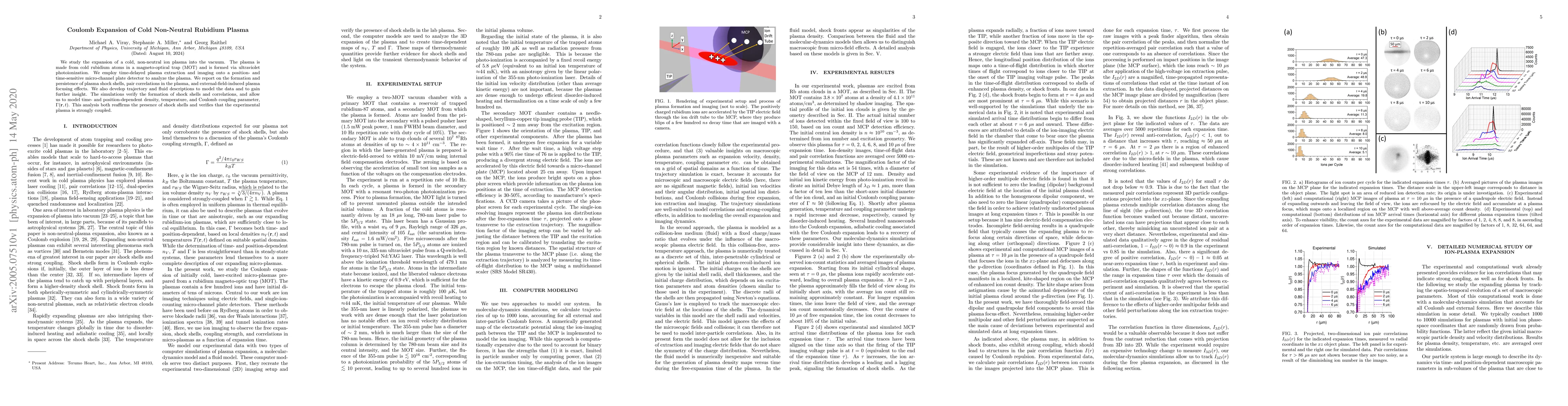 We study the expansion of a cold, non-neutral ion plasma into the vacuum. The plasma is made from cold rubidium atoms in a magneto-optical trap (MOT) and is formed via ultraviolet photoionization. We employ time-delayed plasma extraction and imaging onto a position- and time-sensitive micro-channel plate detector to analyze the plasma. We report on the formation and persistence of plasma shock shells, pair correlations in the plasma, and external-field-induced plasma focusing effects. We also develop trajectory and fluid descriptions to model the data and to gain further insight. The simulations verify the formation of shock shells and correlations, and allow us to model time- and position-dependent density, temperature, and Coulomb coupling parameter, $\Gamma({\bf{r}},t)$. This analysis both reaffirms the presence of shock shells and verifies that the experimental plasma is strongly coupled.
