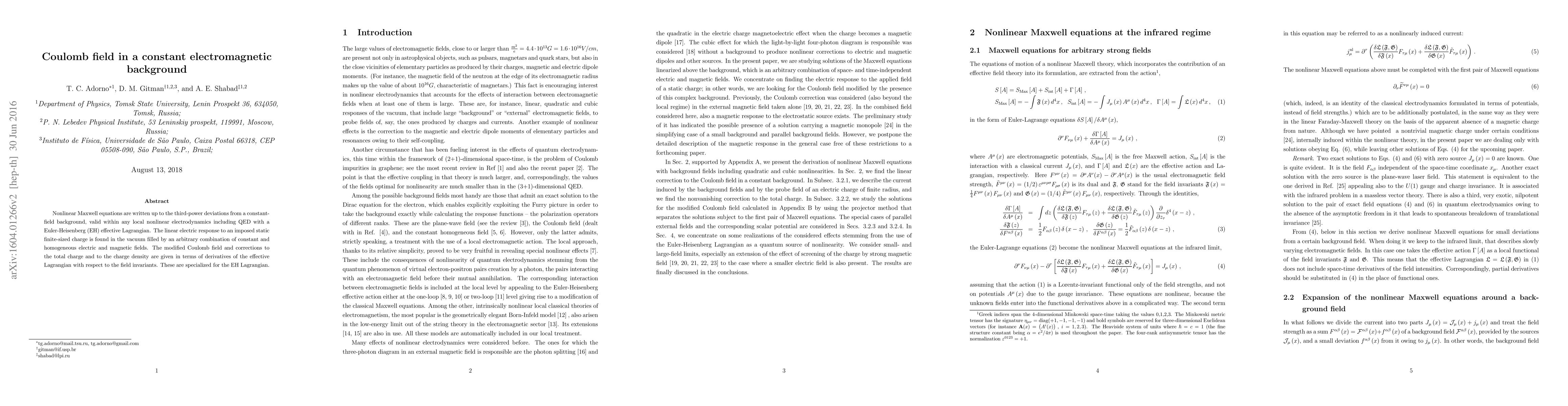 Nonlinear Maxwell equations are written up to the third-power deviations from a constant-field background, valid within any local nonlinear electrodynamics including QED with a Euler-Heisenberg (EH) effective Lagrangian. The linear electric response to an imposed static finite-sized charge is found in the vacuum filled by an arbitrary combination of constant and homogeneous electric and magnetic fields. The modified Coulomb field and corrections to the total charge and to the charge density are given in terms of derivatives of the effective Lagrangian with respect to the field invariants. These are specialized for the EH Lagrangian.