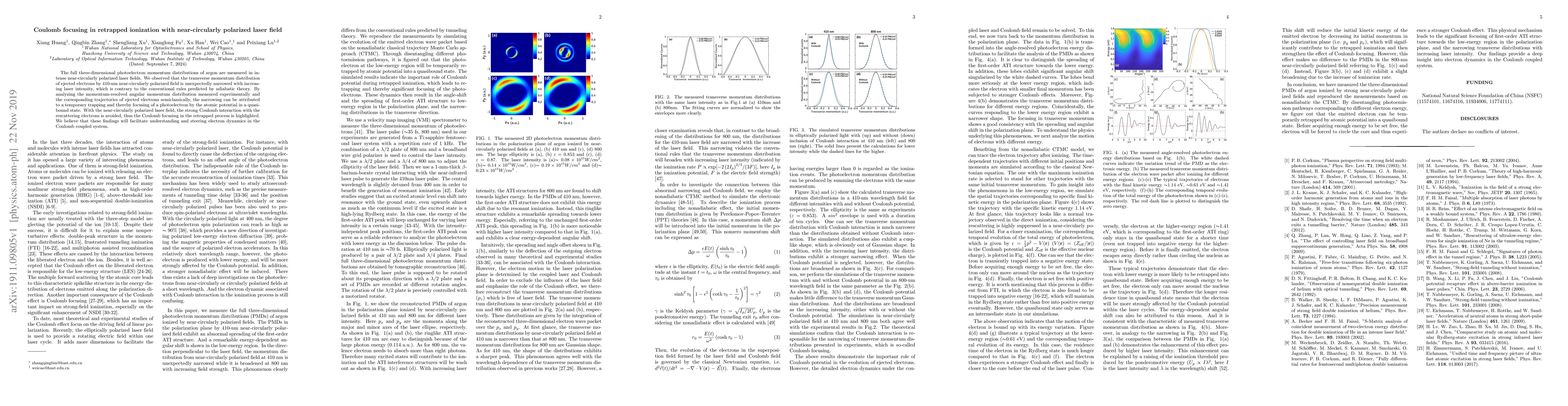 The full three-dimensional photoelectron momentum distributions of argon are measured in intense near-circularly polarized laser fields. We observed that the transverse momentum distribution of ejected electrons by 410-nm near-circularly polarized field is unexpectedly narrowed with increasing laser intensity, which is contrary to the conventional rules predicted by adiabatic theory. By analyzing the momentum-resolved angular momentum distribution measured experimentally and the corresponding trajectories of ejected electrons semiclassically, the narrowing can be attributed to a temporary trapping and thereby focusing of a photoelectron by the atomic potential in a quasibound state. With the near-circularly polarized laser field, the strong Coulomb interaction with the rescattering electrons is avoided, thus the Coulomb focusing in the retrapped process is highlighted. We believe that these findings will facilitate understanding and steering electron dynamics in the Coulomb coupled system.