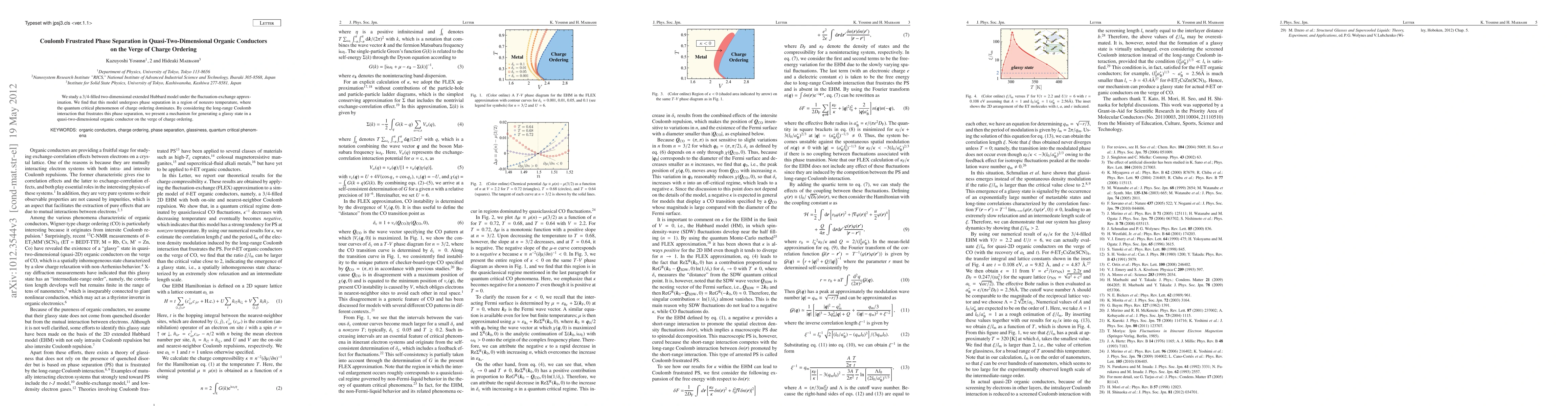 This research reveals Coulomb frustrated phase separation in quasi-2D organic conductors near the threshold of charge ordering, using a 3/4-filled 2D extended Hubbard model. This phenomenon leads to spatial inhomogeneity with slow relaxation and an intermediate length scale.
