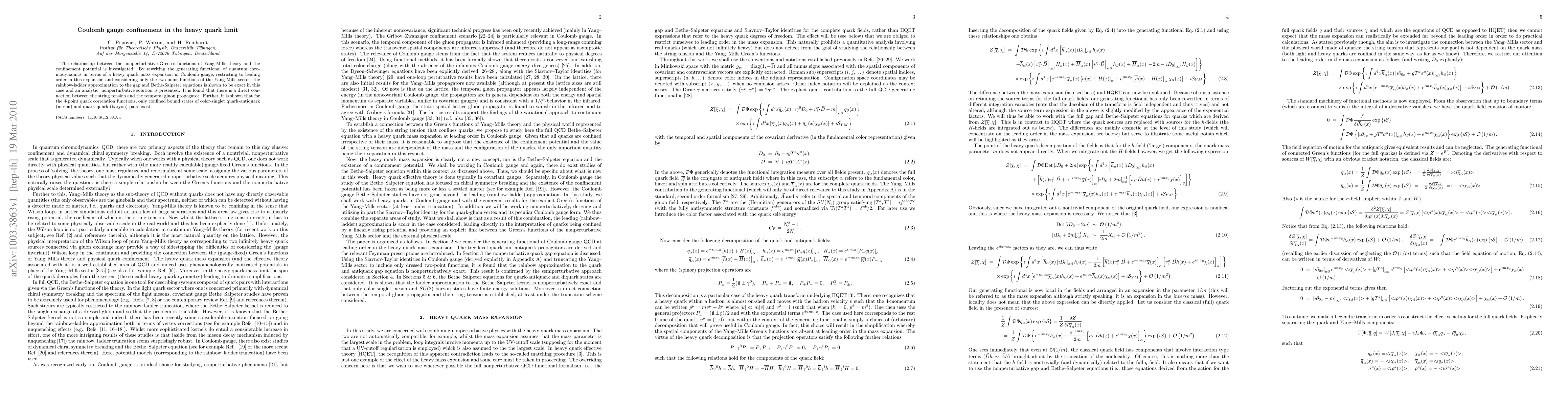 The paper explores the connection between nonperturbative Green's functions in Yang-Mills theory and confinement potential using Coulomb gauge and heavy quark mass expansion, proving the exactness of the rainbow-ladder approximation and revealing a direct link between string tension and the temporal gluon propagator, confirming the existence of confined color-singlet mesons and baryons.
