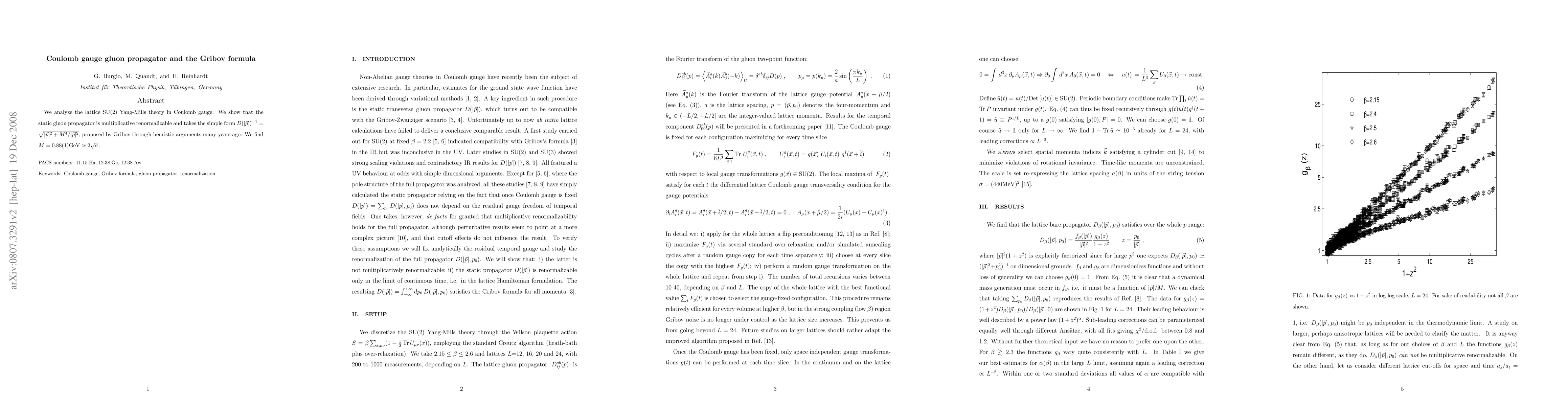 This paper investigates the lattice SU(2) Yang-Mills theory in Coulomb gauge, revealing that the static gluon propagator is multiplicatively renormalizable and follows Gribov's proposed form, $D(|\vec{p}|)^{-1}=\sqrt{|\vec{p}|^2+M^4/|\vec{p}|^2}$. The study determines $M=0.88(1)$ GeV, consistent with $2 \sqrt{\sigma}$.