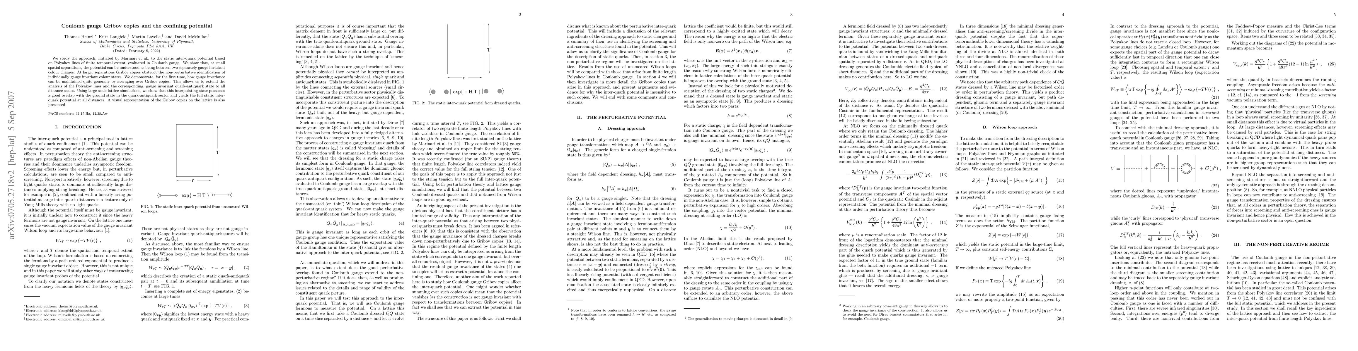 We study the approach, initiated by Marinari et al., to the static inter-quark potential based on Polyakov lines of finite temporal extent, evaluated in Coulomb gauge. We show that, at small spatial separations, the potential can be understood as being between two separately gauge invariant colour charges. At larger separations Gribov copies obstruct the non-perturbative identification of individually gauge invariant colour states. We demonstrate, for the first time, how gauge invariance can be maintained quite generally by averaging over Gribov copies. This allows us to extend the analysis of the Polyakov lines and the corresponding, gauge invariant quark-antiquark state to all distance scales. Using large scale lattice simulations, we show that this interpolating state possesses a good overlap with the ground state in the quark-antiquark sector and yields the full static inter-quark potential at all distances. A visual representation of the Gribov copies on the lattice is also presented.