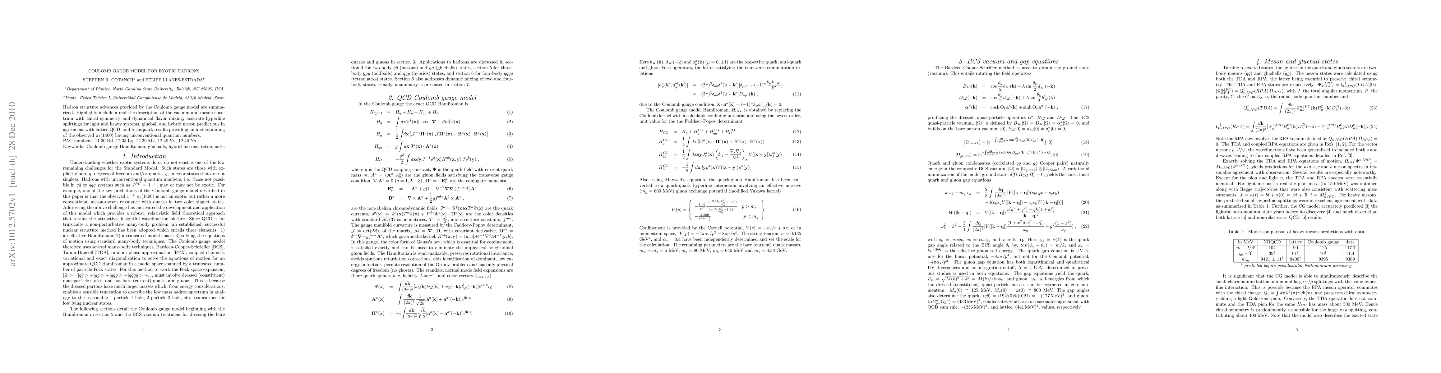 The Coulomb gauge model offers a realistic framework for hadron structure, accurately describing the vacuum, meson spectrum, and hyperfine splittings, while predicting glueball and hybrid mesons consistent with lattice QCD and explaining the pi_1(1400) tetraquark's unusual quantum numbers.