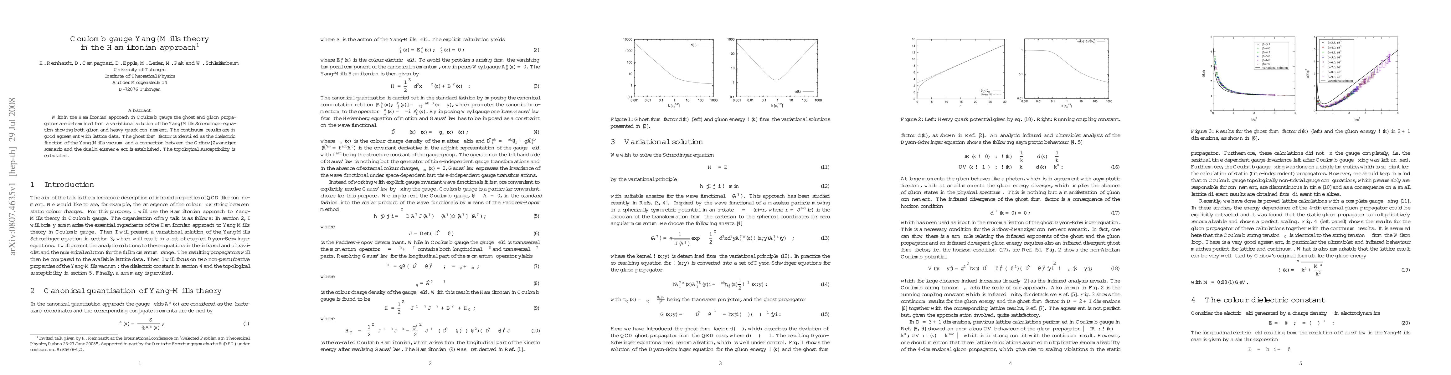 This research explores Coulomb gauge Yang-Mills theory using the Hamiltonian approach, deriving ghost and gluon propagators from the Yang-Mills Schrödinger equation, which demonstrates gluon and quark confinement, aligns well with lattice data, and connects the Gribov-Zwanziger scenario to the dual Meissner effect. The topological susceptibility is also calculated.