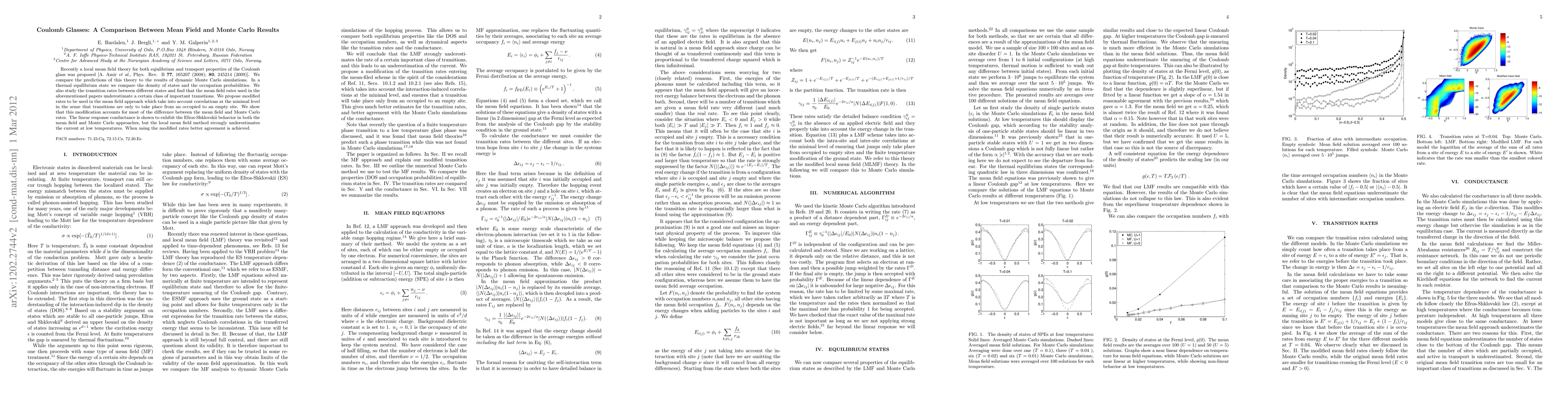 Recently a local mean field theory for both eqilibrium and transport properties of the Coulomb glass was proposed [A. Amir et al., Phys. Rev. B 77, 165207 (2008); 80, 245214 (2009)]. We compare the predictions of this theory to the results of dynamic Monte Carlo simulations. In a thermal equilibrium state we compare the density of states and the occupation probabilities. We also study the transition rates between different states and find that the mean field rates underestimate a certain class of important transitions. We propose modified rates to be used in the mean field approach which take into account correlations at the minimal level in the sense that transitions are only to take place from an occupied to an empty site. We show that this modification accounts for most of the difference between the mean field and Monte Carlo rates. The linear response conductance is shown to exhibit the Efros-Shklovskii behaviour in both the mean field and Monte Carlo approaches, but the mean field method strongly underestimates the current at low temperatures. When using the modified rates better agreement is achieved.