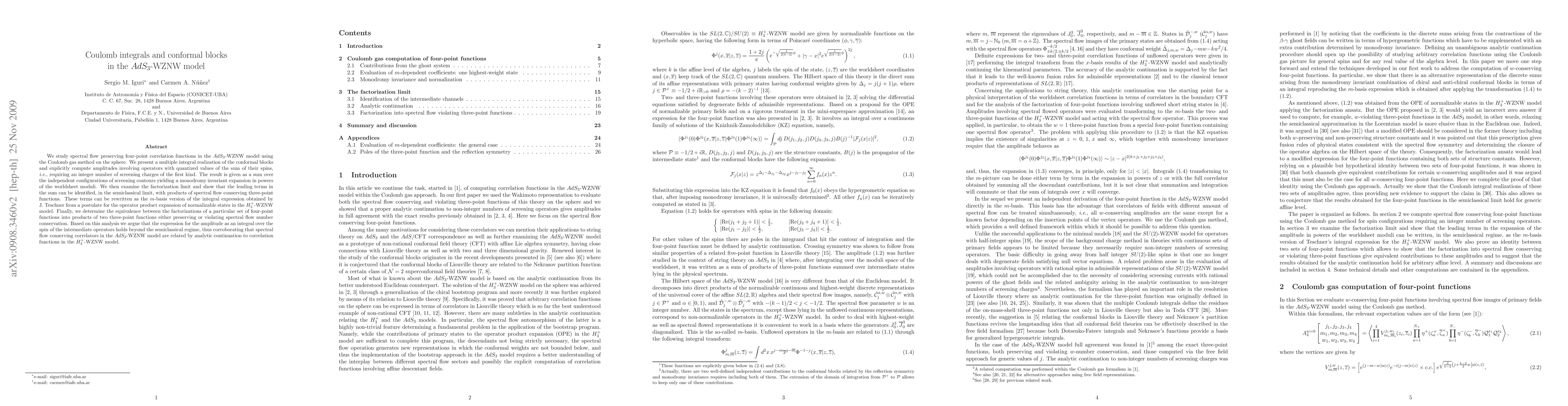 This paper explores spectral flow preserving four-point correlation functions in the AdS3-WZNW model using the Coulomb gas method, presenting a multiple integral realization of conformal blocks and computing amplitudes involving quantized spin operators. It argues that the integral expression for these amplitudes holds beyond the semiclassical regime, linking spectral flow conserving correlators in the AdS3-WZNW model to those in the H3+-WZNW model via analytic continuation.