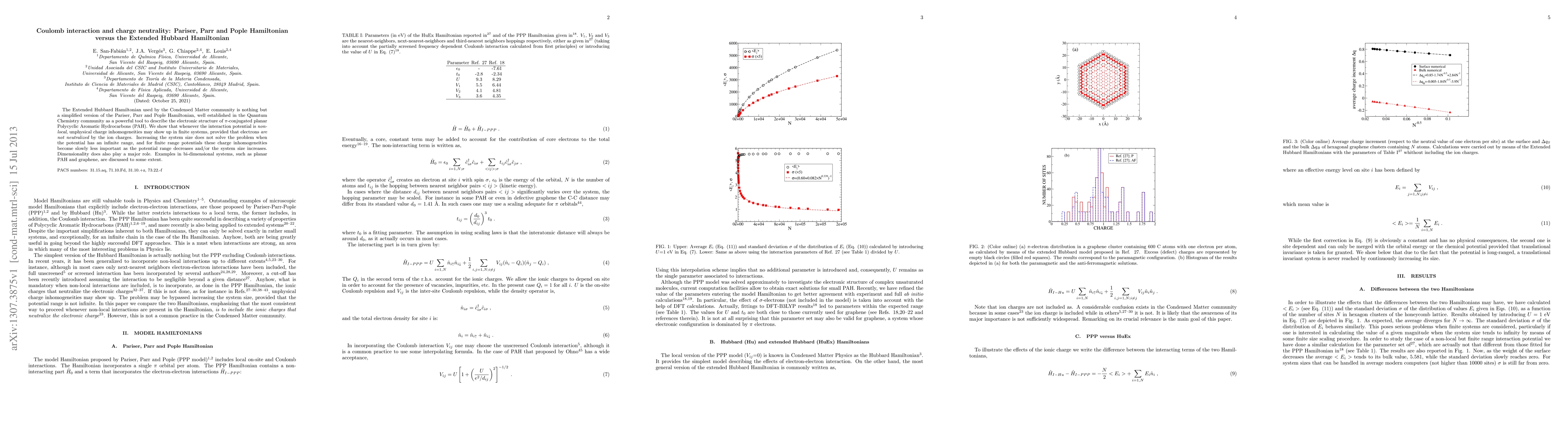 This paper compares the Extended Hubbard Hamiltonian with the Pariser, Parr, and Pople Hamiltonian, highlighting that the former is a simplified version of the latter used in quantum chemistry. It discusses how non-local interaction potentials can lead to unphysical charge inhomogeneities in finite systems unless electrons are neutralized by ion charges, with dimensionality and potential range being significant factors.
