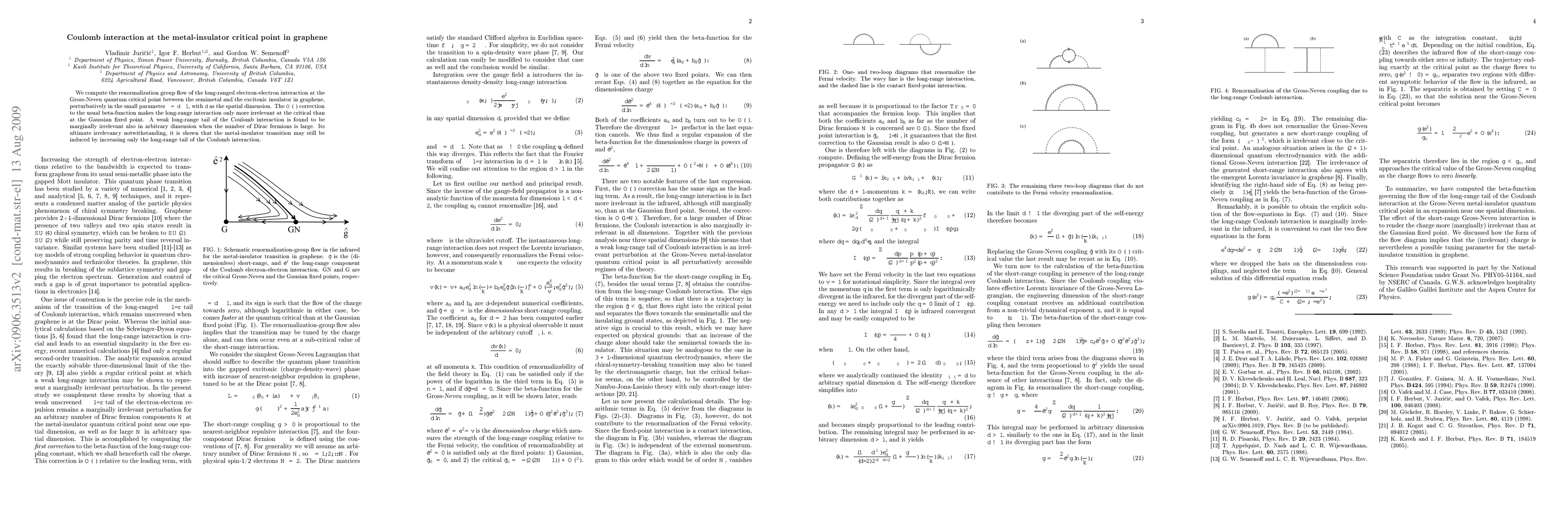 This paper investigates the renormalization group flow of electron-electron interactions at the critical point between graphene's semimetal and excitonic insulator phases, finding that long-range Coulomb interactions are ultimately irrelevant but can still induce the metal-insulator transition. The study reveals $O(\epsilon)$ corrections that show the long-range interaction's influence near the critical point.
