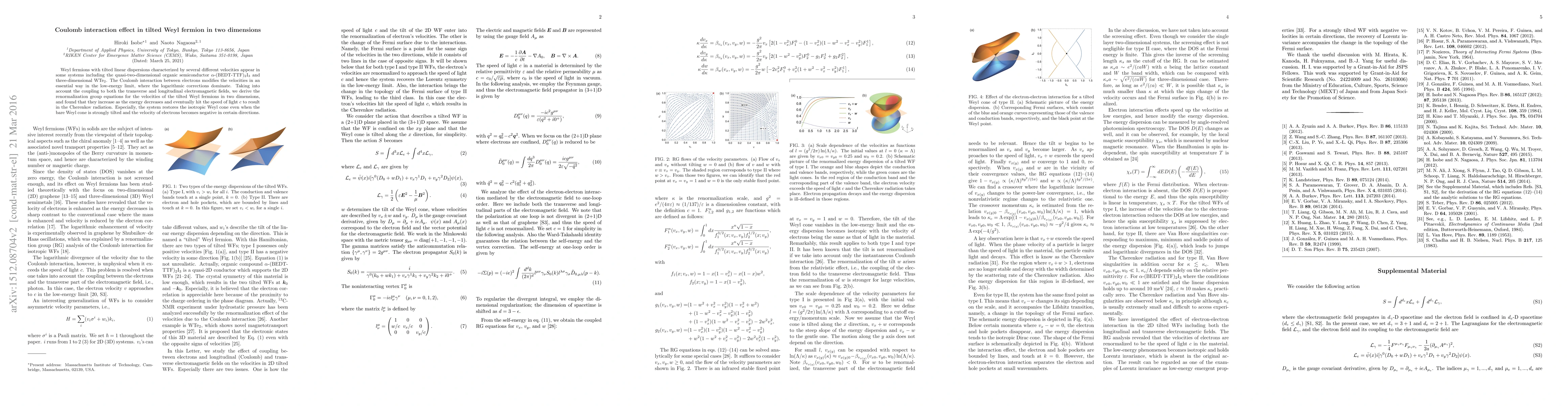 This paper investigates how Coulomb interactions affect the velocities of tilted Weyl fermions in two dimensions, showing that these velocities increase with decreasing energy, potentially leading to Cherenkov radiation as they approach the speed of light. It also reveals that the system can restore an isotropic Weyl cone even from strongly tilted initial conditions.