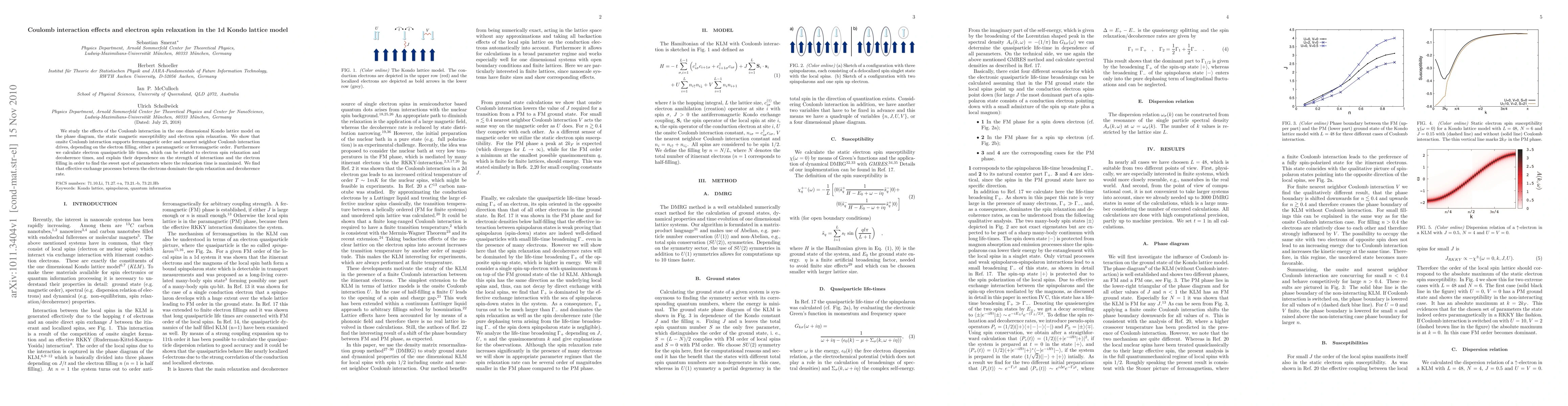 This paper investigates the impact of Coulomb interactions in the 1D Kondo lattice model on phase behavior, magnetic susceptibility, and electron spin relaxation. It reveals that onsite and nearest-neighbor Coulomb interactions can induce ferromagnetic or paramagnetic order, and identifies conditions maximizing electron spin relaxation times through effective exchange processes.