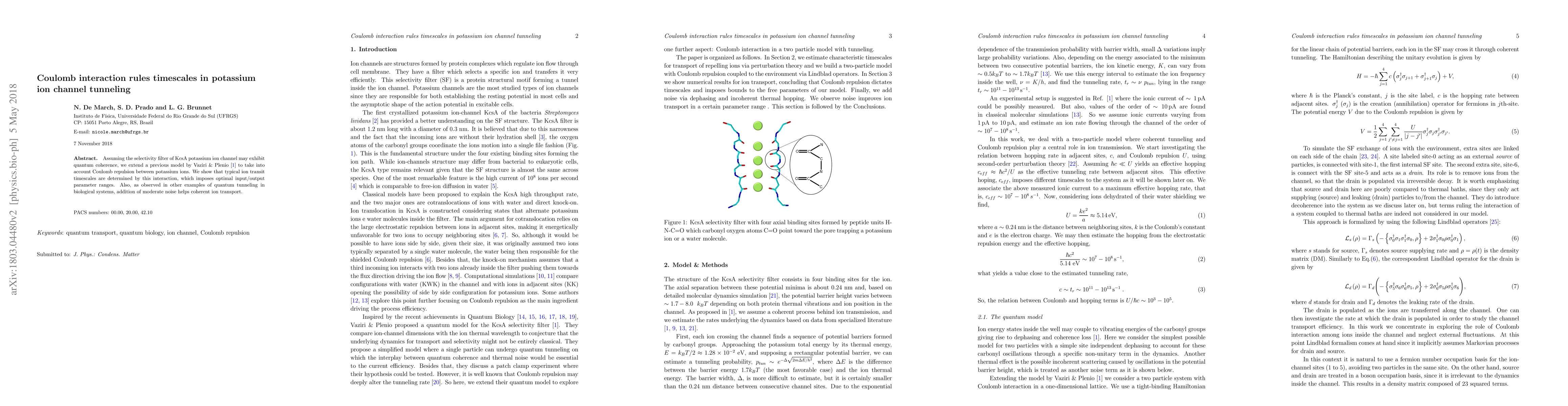 The study finds that Coulomb repulsion between potassium ions affects ion transit timescales in a potassium channel, influencing optimal transport ranges. Adding noise helps coherent ion transport, similar to other biological systems.