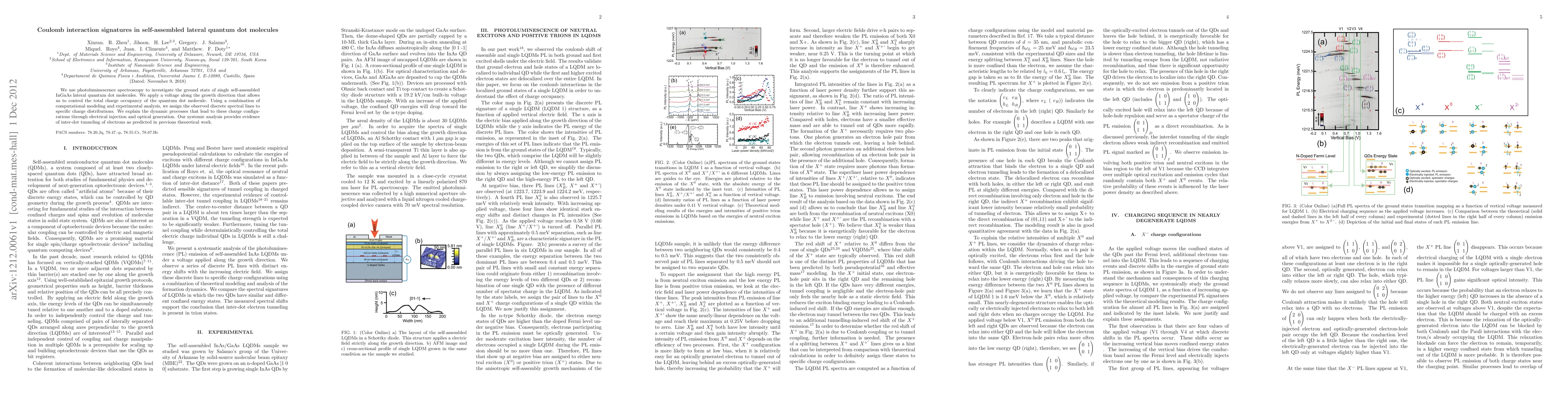 This study employs photoluminescence spectroscopy to examine the ground state of InGaAs lateral quantum dot molecules, revealing Coulomb interaction signatures. Through voltage control and computational modeling, discrete spectral lines are linked to specific charge distributions, providing evidence for inter-dot electron tunneling.