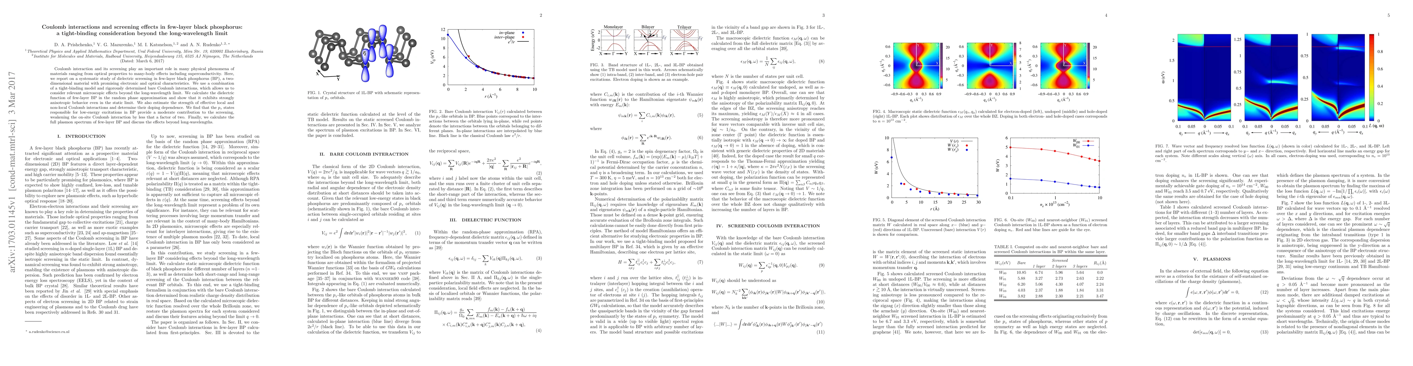 This paper investigates dielectric screening in few-layer black phosphorus using a tight-binding model, revealing strongly anisotropic behavior and moderate contribution from $p_z$ states to screening. It also calculates the full plasmon spectrum and discusses effects beyond the long-wavelength limit.