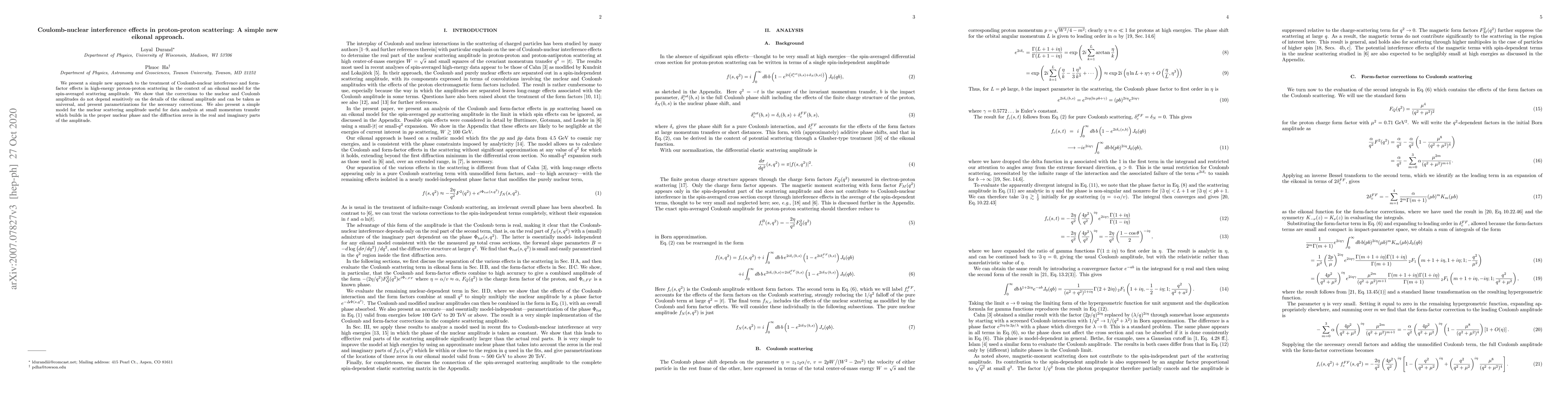 The paper introduces a novel eikonal approach to address Coulomb-nuclear interference and form-factor effects in high-energy proton-proton scattering, demonstrating that the necessary corrections can be considered universal and providing parametrizations for these corrections. It also offers a simplified model for nuclear scattering amplitude, incorporating nuclear phase and diffraction zeros for data analysis at low momentum transfer.
