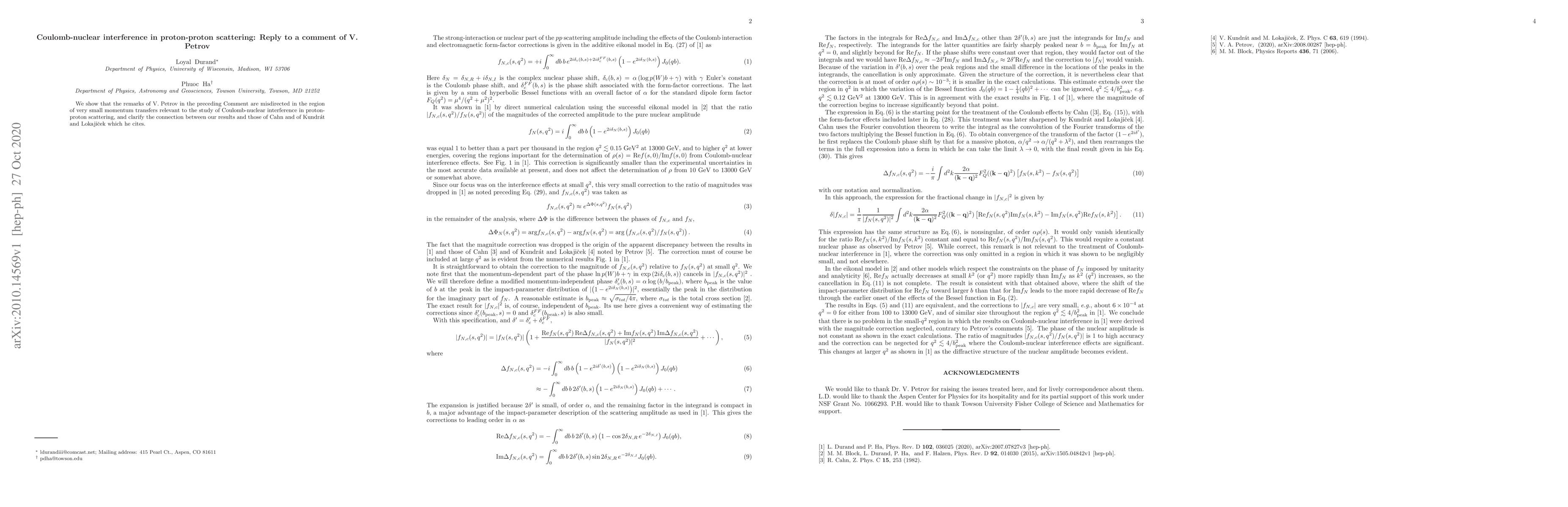 This paper refutes V. Petrov's critique regarding Coulomb-nuclear interference in proton-proton scattering, asserting that Petrov's remarks are misdirected for small momentum transfers. It also clarifies the relationship between the authors' findings and those of Cahn, as well as Kundrát and Lokajíček.