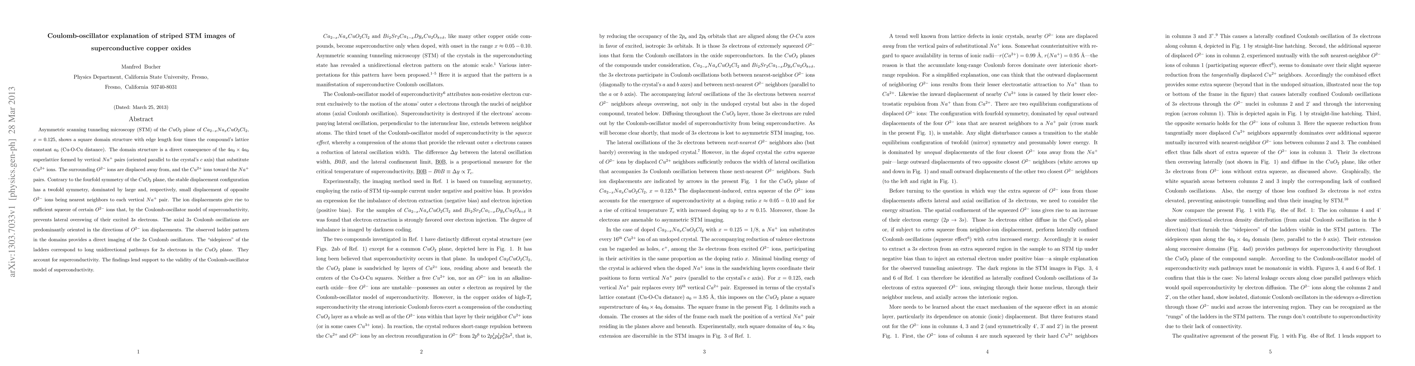 This paper explains the formation of striped scanning tunneling microscopy (STM) images in superconductive copper oxides through a Coulomb-oscillator model. The observed square domain structure results from a superlattice formed by vertical Na+ pairs, leading to specific displacements of O2- ions and Cu2+ ions, which create pathways for 3s electron oscillations, supporting superconductivity.