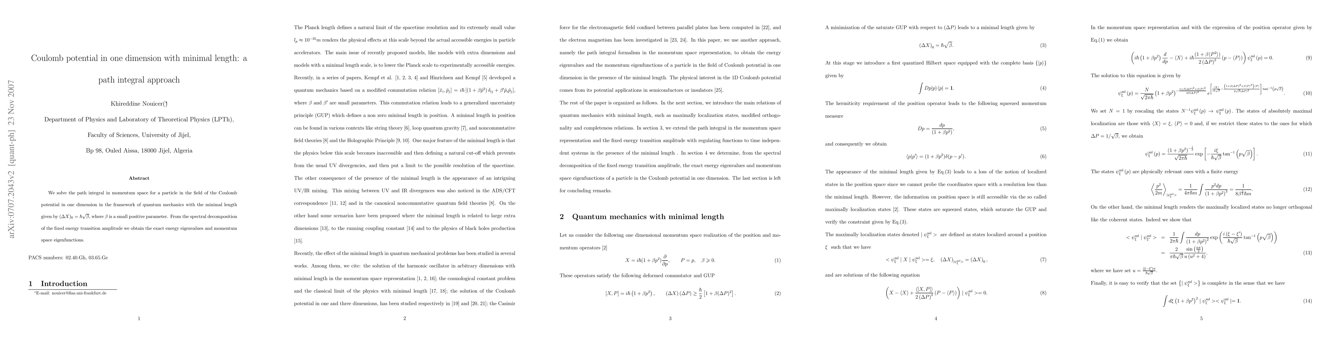 This paper solves the path integral in momentum space for a particle in a one-dimensional Coulomb potential, incorporating a minimal length $(\Delta X)_{0}=\hbar \sqrt{\beta}$. The study derives exact energy eigenvalues and momentum space eigenfunctions through the spectral decomposition of the fixed energy transition amplitude.