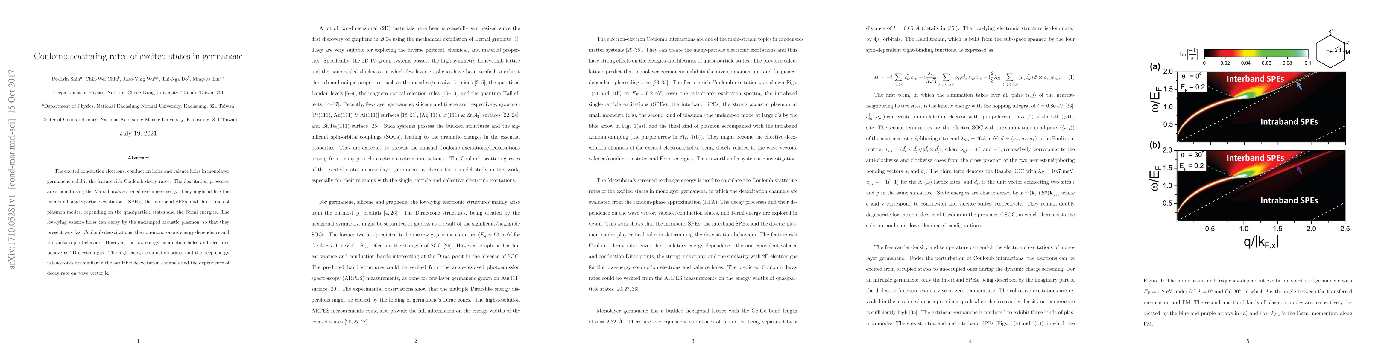 This research investigates Coulomb scattering rates in excited states of monolayer germanene, revealing that low-lying valence holes exhibit rapid deexcitation via undamped acoustic plasmons, while conduction states behave akin to a 2D electron gas, with high-energy states showing similar deexcitation dynamics.
