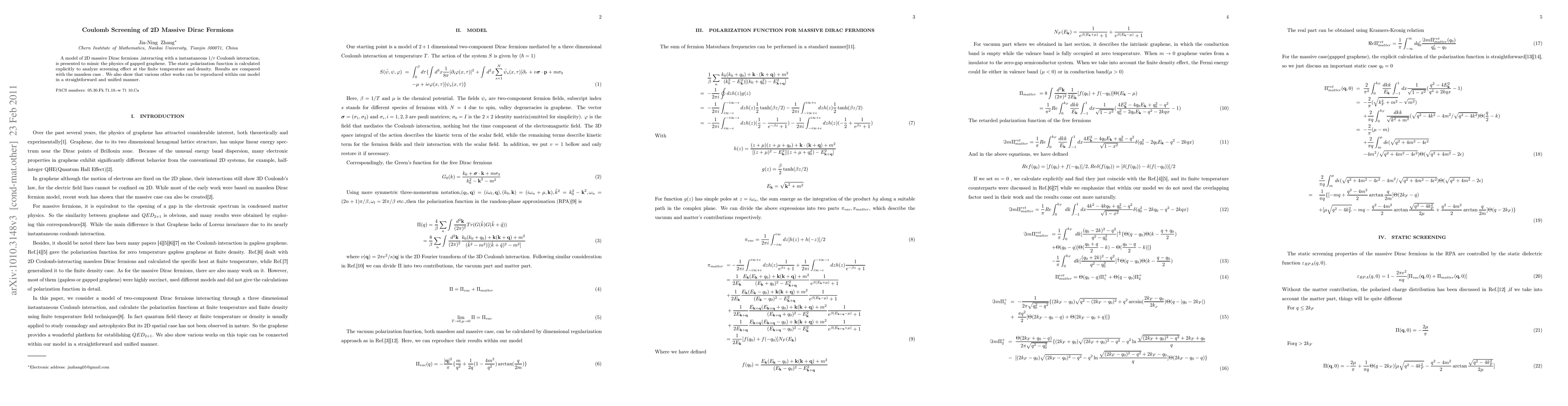 This paper explores a 2D massive Dirac fermions model with a Coulomb interaction to simulate gapped graphene. It calculates the static polarization function to analyze the Coulomb screening effect at finite temperature and density, comparing results with the massless case and showing the model's ability to reproduce various other studies.