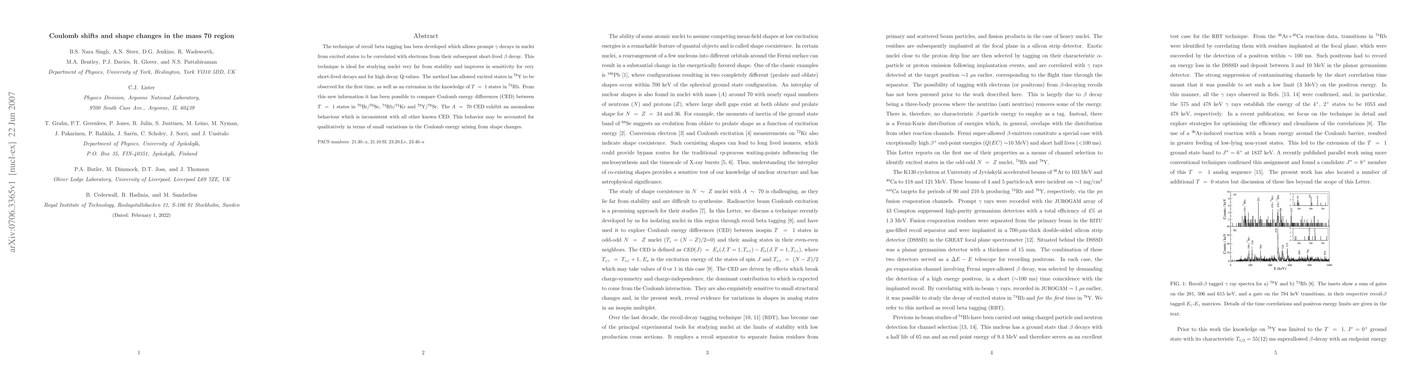The technique of recoil beta tagging has been developed which allows prompt gamma decays in nuclei from excited states to be correlated with electrons from their subsequent short-lived beta decay. This technique is ideal for studying nuclei very far from stability and improves in sensitivity for very short-lived decays and for high decay Q-values. The method has allowed excited states in 78Y to be observed for the first time, as well as an extension in the knowledge of T=1 states in 74Rb. From this new information it has been possible to compare Coulomb energy differences (CED) between T=1 states in 70Br/70Se, 74Rb/74Kr, and 78Y/78Sr. The A=70 CED exhibit an anomalous behavior which is inconsistent with all other known CED. This behavior may be accounted for qualitatively in terms of small variations in the Coulomb energy arising from shape changes.