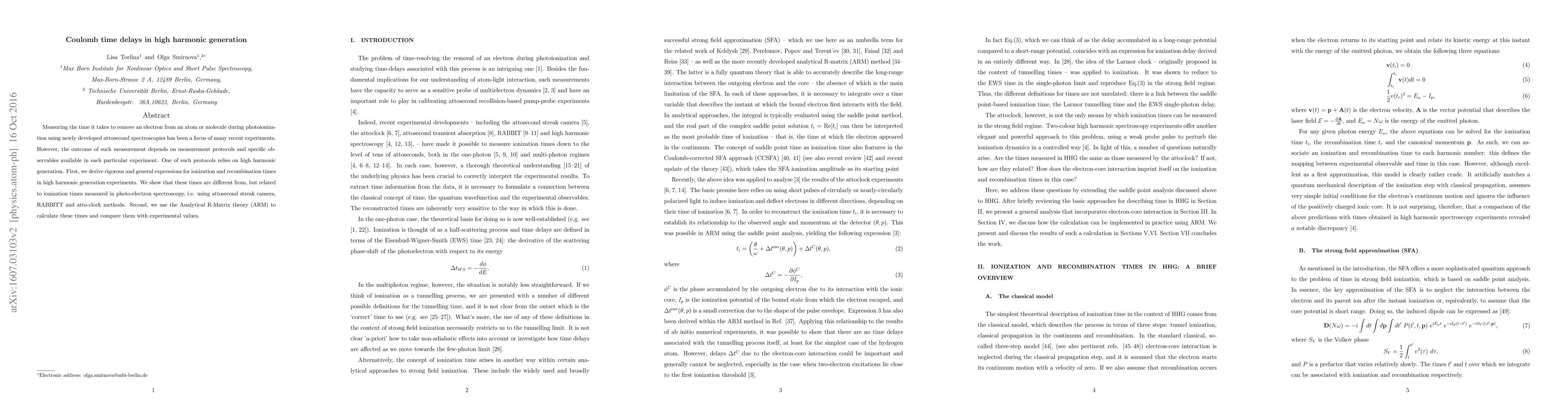Measuring the time it takes to remove an electron from an atom or molecule during photoionization using newly developed attosecond spectroscopies has been a focus of many recent experiments. However, the outcome of such measurement depends on measurement protocols and specific observables available in each particular experiment. One of such protocols relies on high harmonic generation. First, we derive rigorous and general expressions for ionization and recombination times in high harmonic generation experiments. We show that these times are different from, but related to ionization times measured in photo-electron spectroscopy, i.e. using attosecond streak camera, RABBITT and atto-clock methods. Second, we use the Analytical R-Matrix theory (ARM) to calculate these times and compare them with experimental values.