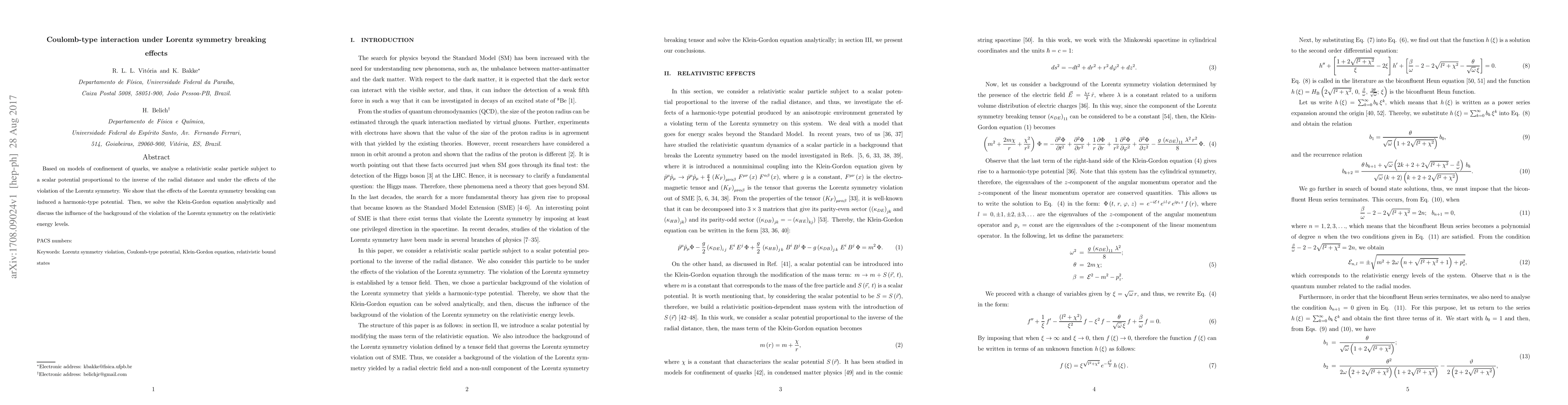 Based on models of confinement of quarks, we analyse a relativistic scalar particle subject to a scalar potential proportional to the inverse of the radial distance and under the effects of the violation of the Lorentz symmetry. We show that the effects of the Lorentz symmetry breaking can induced a harmonic-type potential. Then, we solve the Klein-Gordon equation analytically and discuss the influence of the background of the violation of the Lorentz symmetry on the relativistic energy levels.