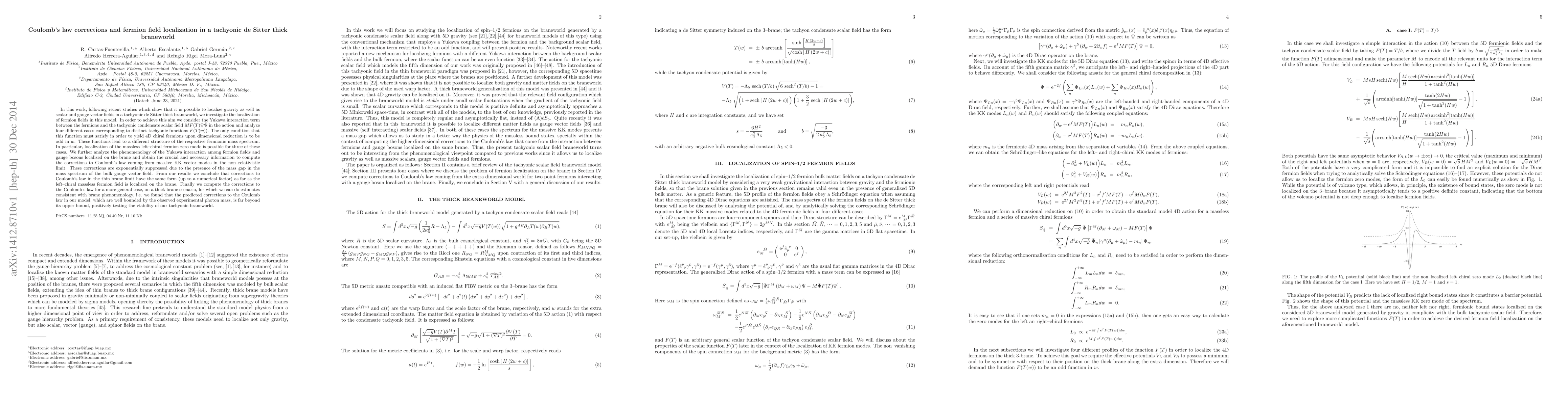 Researchers investigate fermion field localization in a tachyonic de Sitter thick braneworld, finding that only specific tachyonic functions allow for the localization of massless left-chiral fermions, which leads to corrections to Coulomb's law with exponentially suppressed effects.